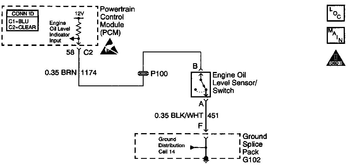 The engine oil level switch is a simple float switch that is grounded when the engine oil level is OK. The Powertrain Control Module (PCM) checks the engine oil level switch circuit at start-up. Before checking the state of the engine oil level switch, the PCM performs a test routine based on time and Engine Coolant Temperature (ECT) to ensure that the engine oil has drained back into the sump. To test for low oil level at start-up, both of the following conditions must be present: