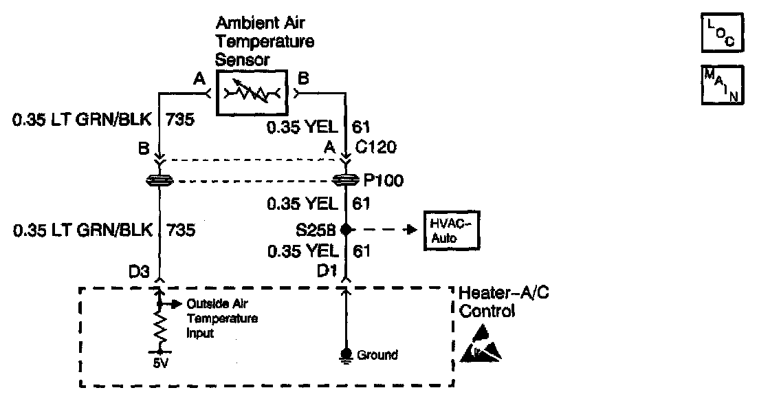 The heater-A/C control determines the outside air temperature through an input from the ambient air temperature sensor. The heater-A/C control receives a voltage signal from the ambient air temperature sensor through circuit 735 (LT GRN/BLK). The ambient air temperature sensor is grounded by the heater-A/C control through circuit 61 (YEL).