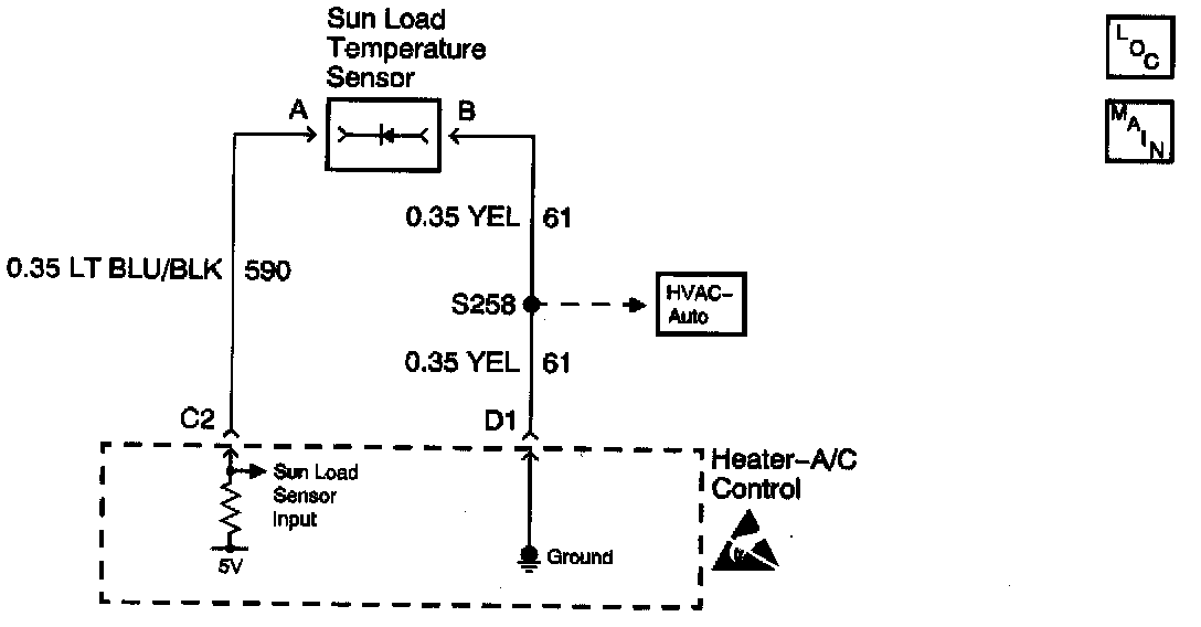 The heater-A/C control determines the amount of sunlight produced by the sun through an input from the sun load temperature sensor. The heater-A/C control receives a voltage signal from the sun load temperature sensor through circuit 590 (LT BLU/BLK). The sun load temperature sensor is grounded by the heater-A/C control through circuit 61 (YEL). As the sunlight increases, the electric current flowing through the sun load temperature sensor increases. When the heater-A/C control is in AUTO mode, the heater-A/C control uses the sun load temperature sensor information in order to control the blower speed and the BI-LEVEL modes.