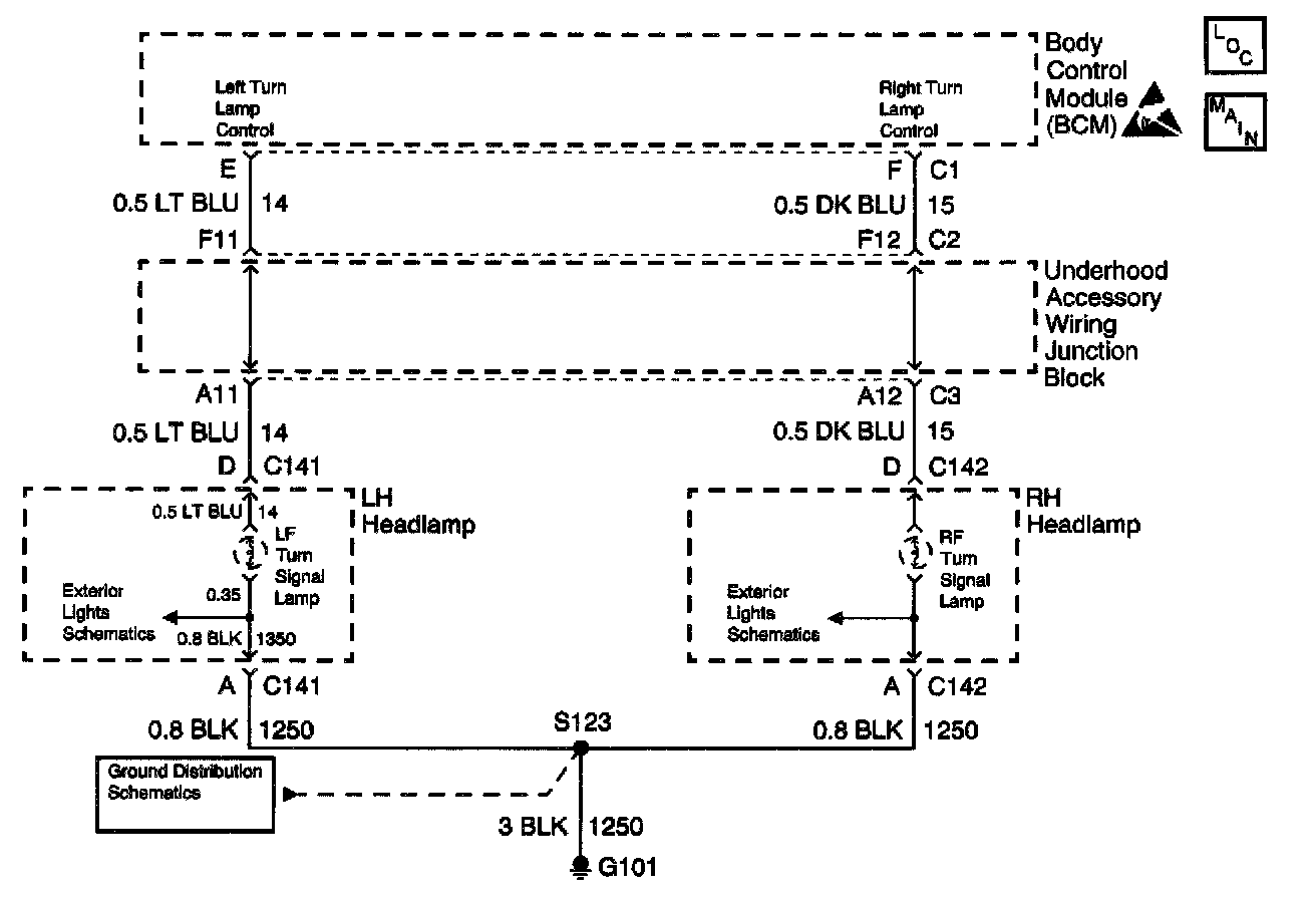 The Body Control Module (BCM) controls the LF turn signal lamp. The BCM applies power to the LF turn signal lamp which in turns energizes the turn lamp.