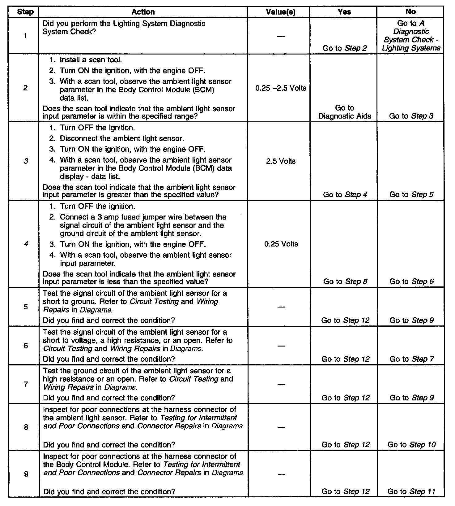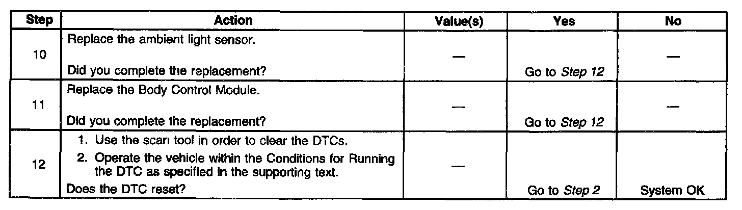 ^ The BCM no longer detects a short to ground in the ambient light sensor signal circuit.