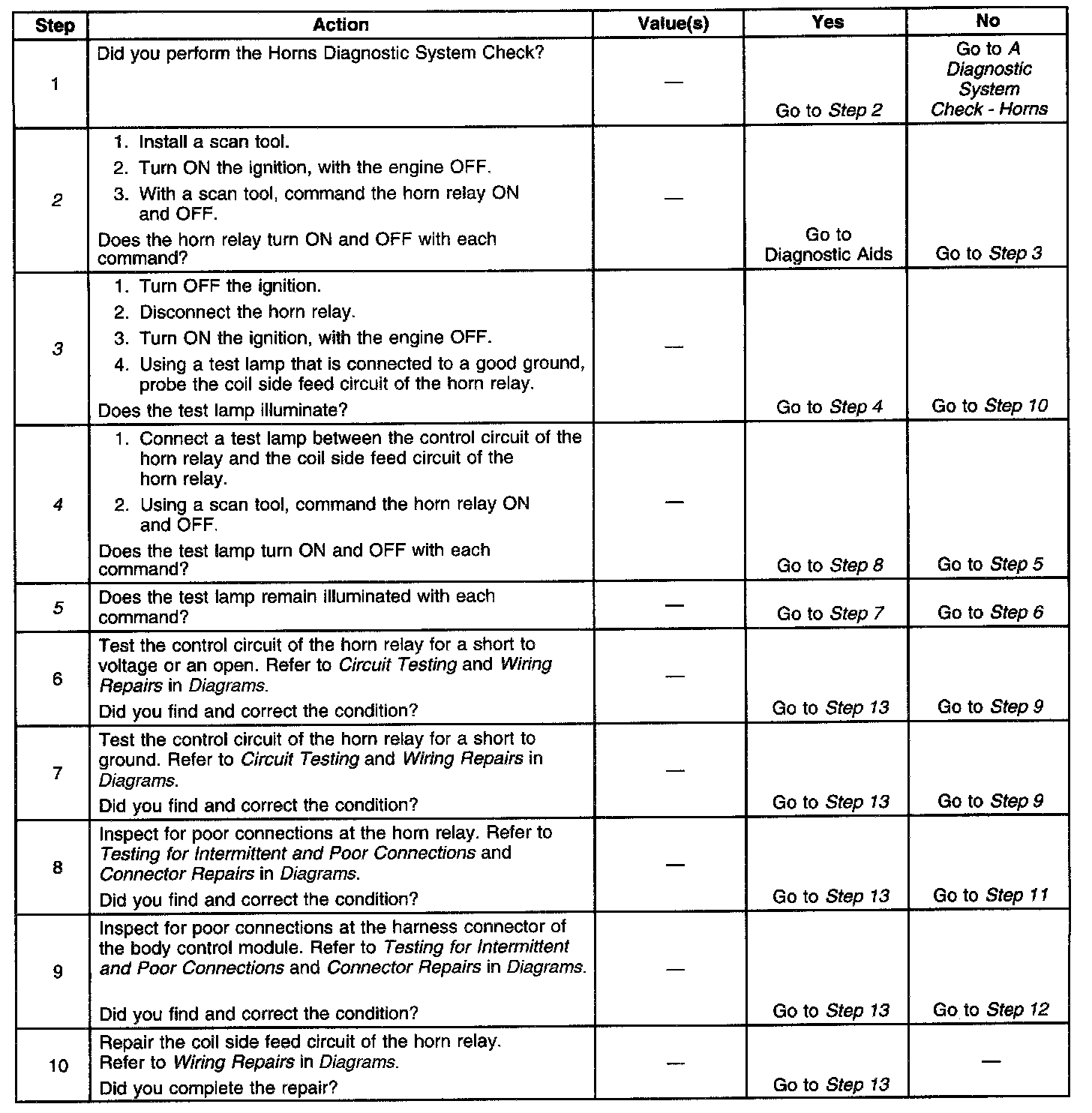 The number(s) below refer to the step number(s) on the diagnostic table.