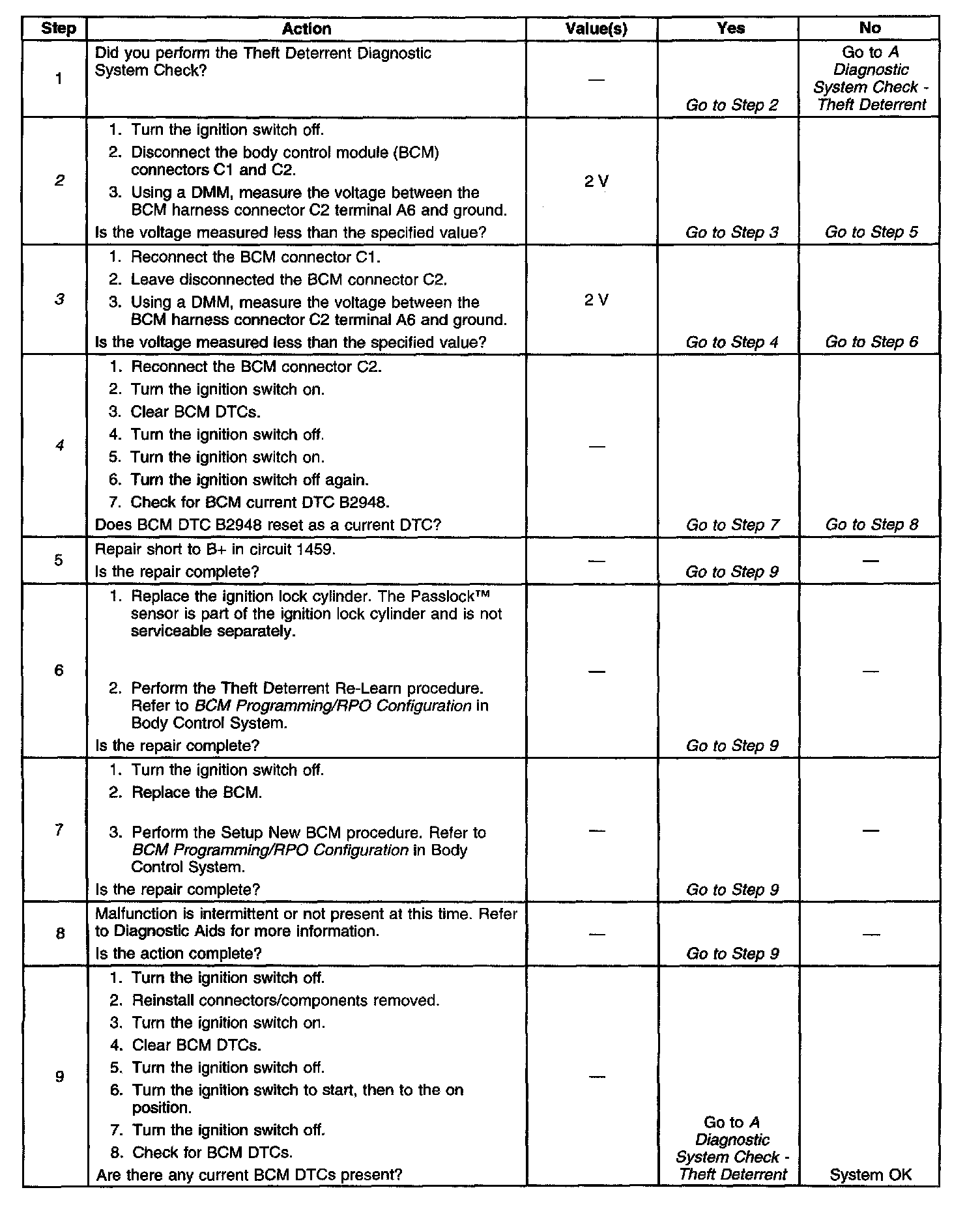 ^ Even when a short to B+ is present in circuit 1459, turning the ignition switch from off to accessory will clear this DTC as a current DTC. This DTC will reset as a current DTC when the ignition switch is off with the BCM in the wake-up state.