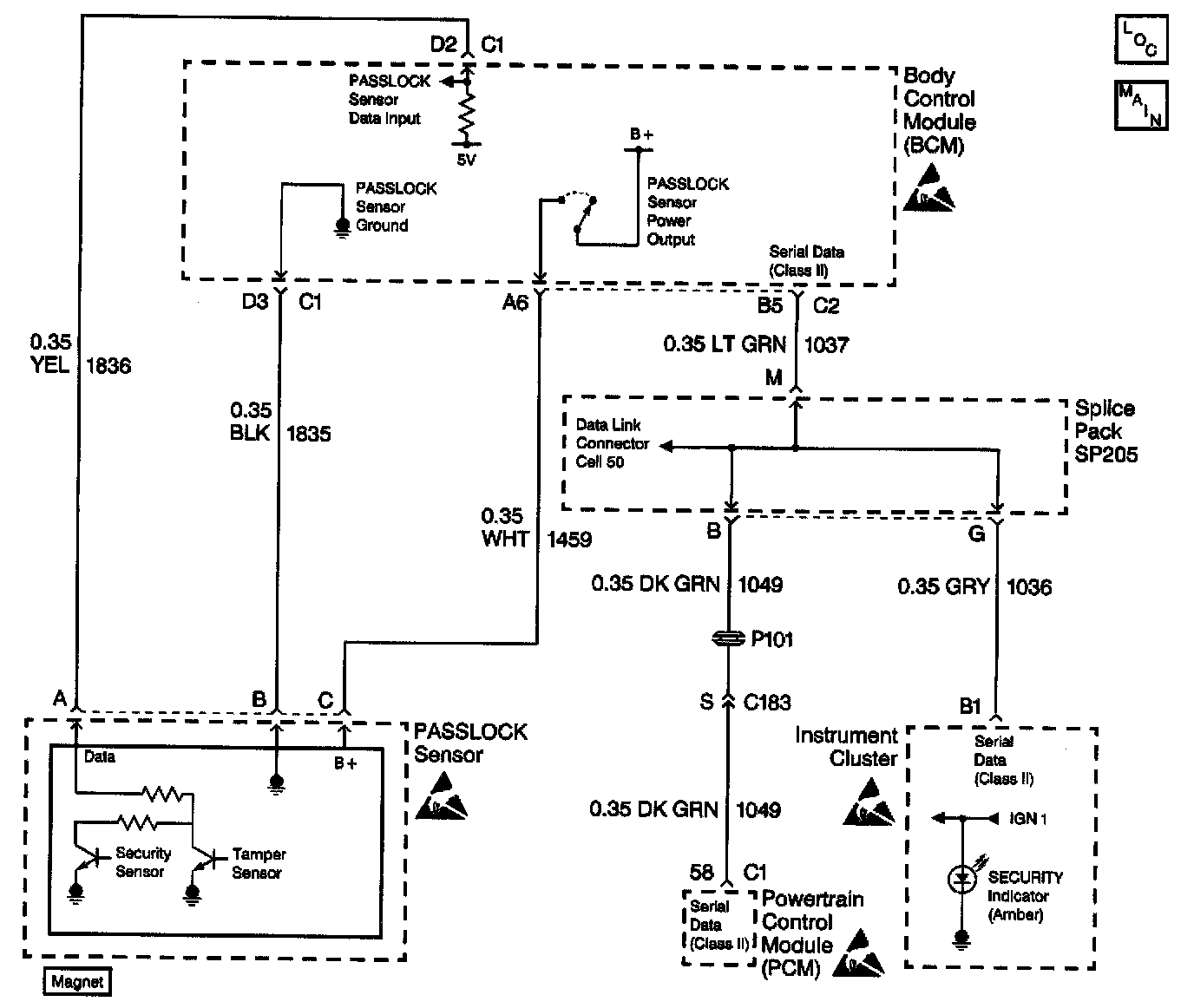 The PASSLOCK theft deterrent system contains a PASSLOCK sensor. The PASSLOCK sensor is part of the ignition lock cylinder assembly. The body control module (BCM) provides voltage (B+) to the PASSLOCK sensor through circuit 1459 when the ignition switch is in the accessory, on, or start. The BCM also provides ground to the PASSLOCK sensor through circuit 1835. The PASSLOCK sensor interfaces with the BCM through the PASSLOCK detection circuit 1836.