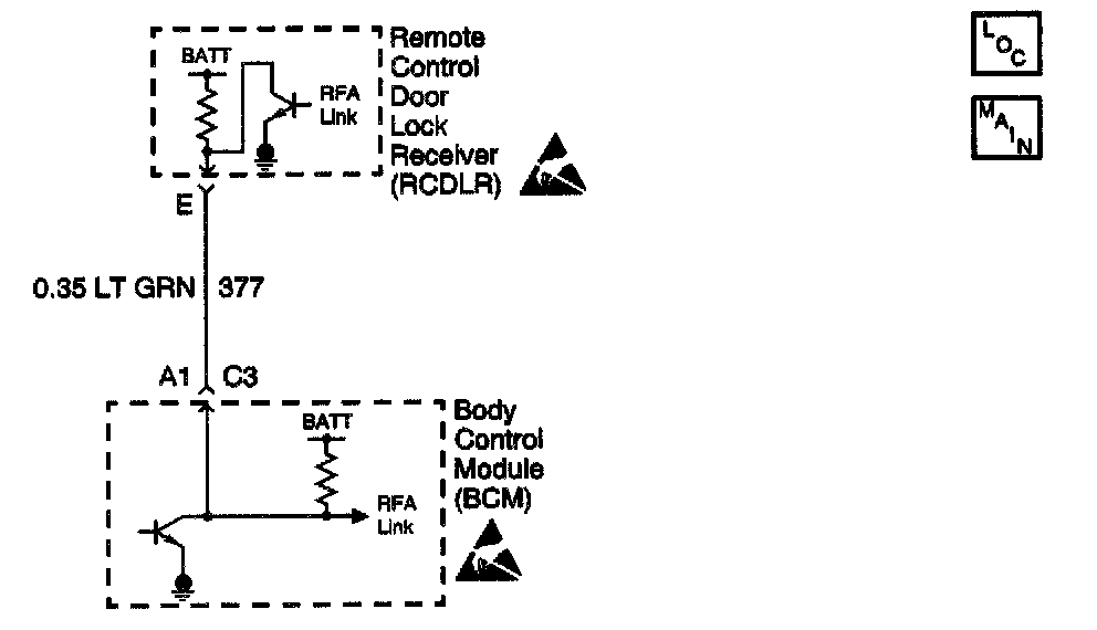 The Body Control Module (BCM) is connected to the Remote Control Door Lock Receiver by the communication circuit. This circuit is the Serial data link for communication between the two modules.