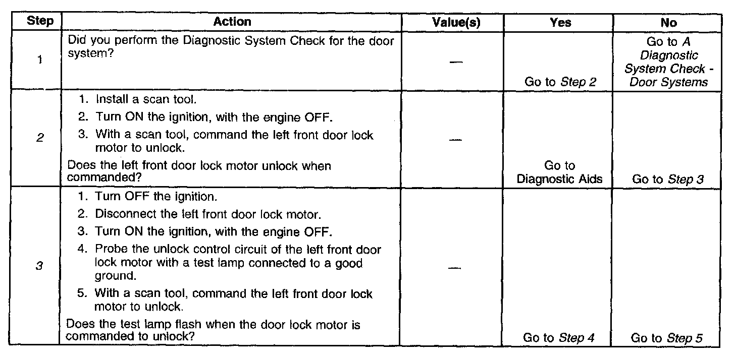2. Listen for an audible noise when the left front door lock motor is commanded to unlock. Command the door lock motor to lock and unlock. Repeat the commands as necessary.