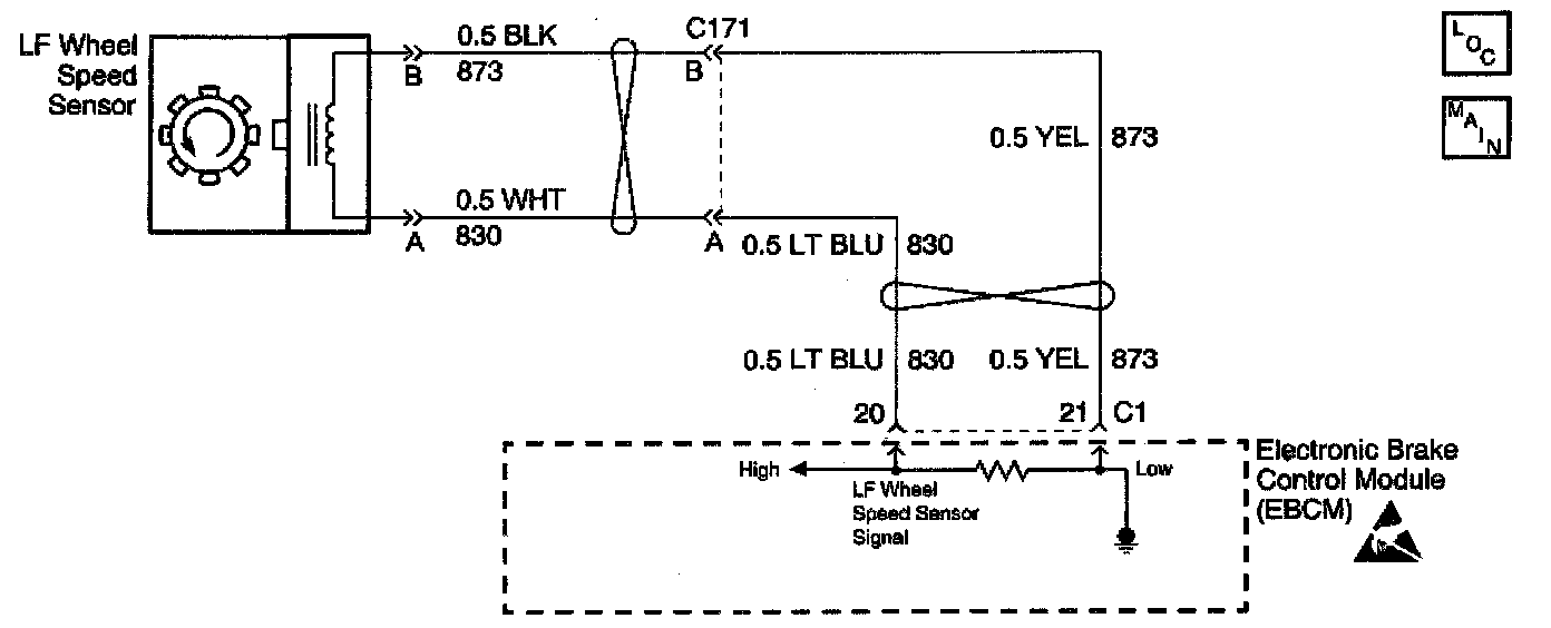 The speed sensor used on this vehicle is a multiple pole magnetic pickup. This sensor produces an AC signal that the EBCM uses the frequency from to calculate the wheel speed.