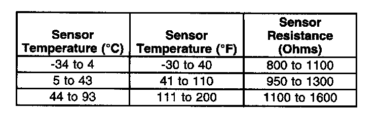 The following table contains resistance values for the front wheel speed sensors at varying sensor temperatures for use in diagnosis. The values are approximate and should be used as a guideline for diagnosis.