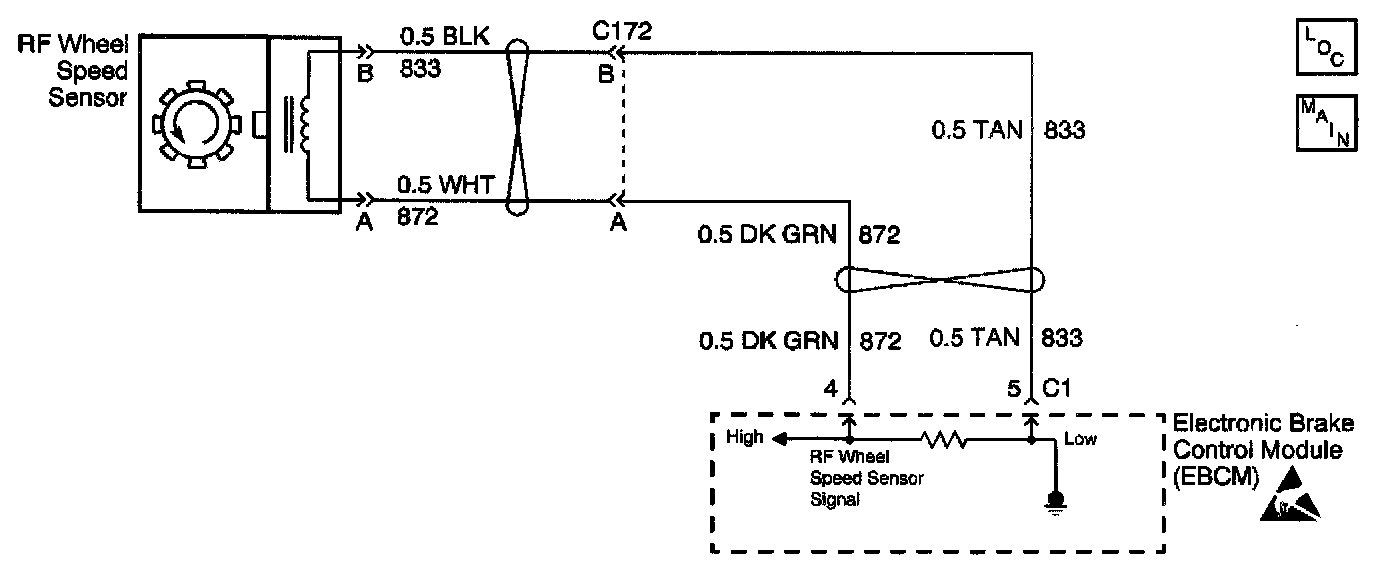 The speed sensor used on this vehicle is a multiple pole magnetic pickup. This sensor produces an AC signal that the EBCM uses the frequency from to calculate the wheel speed.