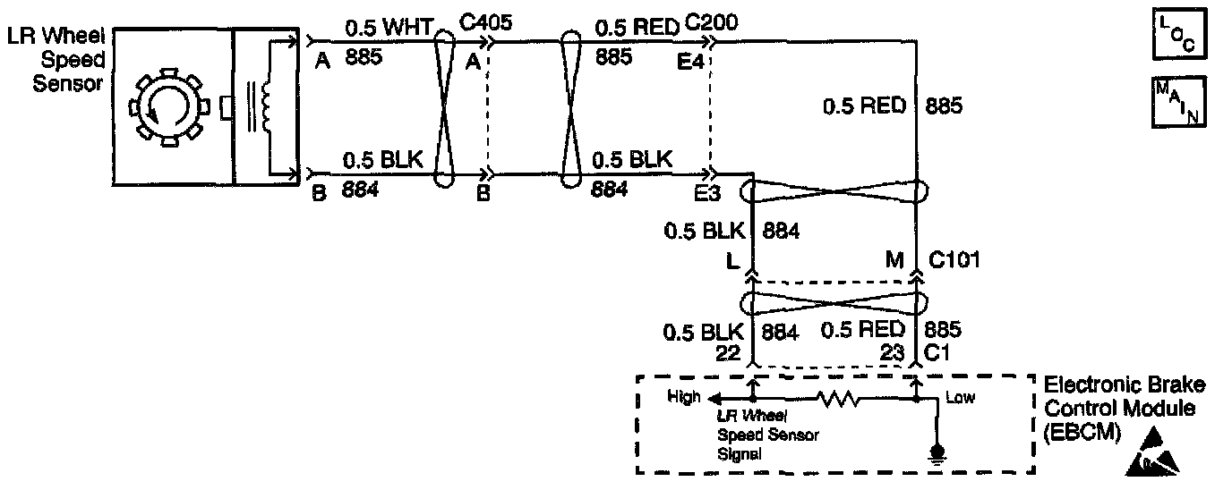 The speed sensor used on this vehicle is a multiple pole magnetic pickup. This sensor produces an AC signal that the EBCM uses the frequency from to calculate the wheel speed.