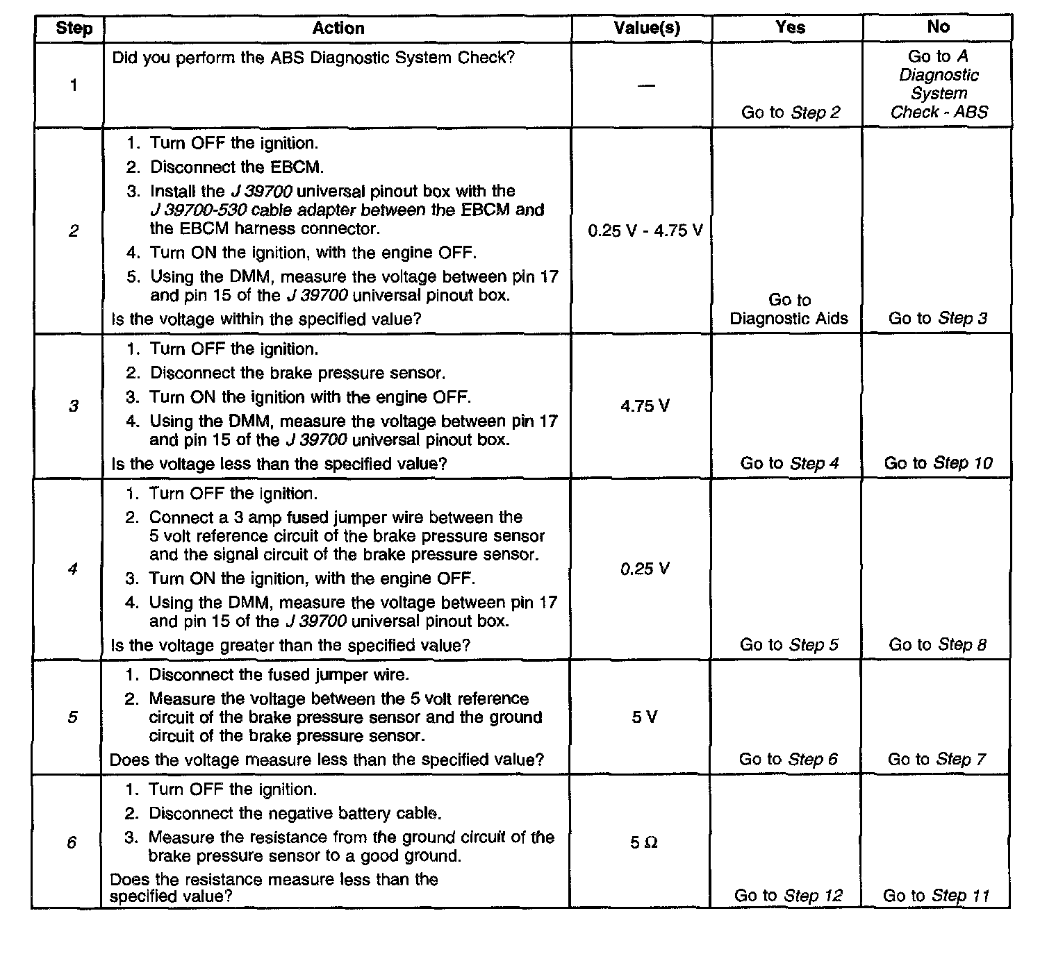 2. Tests for specified voltage on the brake pressure signal circuit.