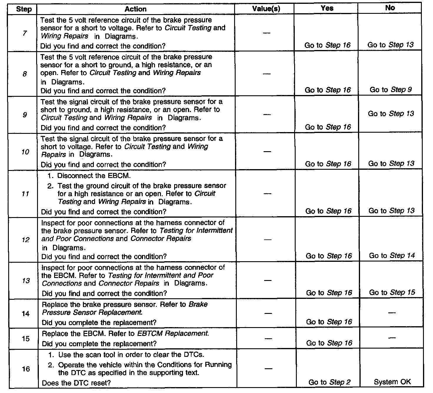 10. Tests for a short to voltage in the brake pressure sensor signal circuit.