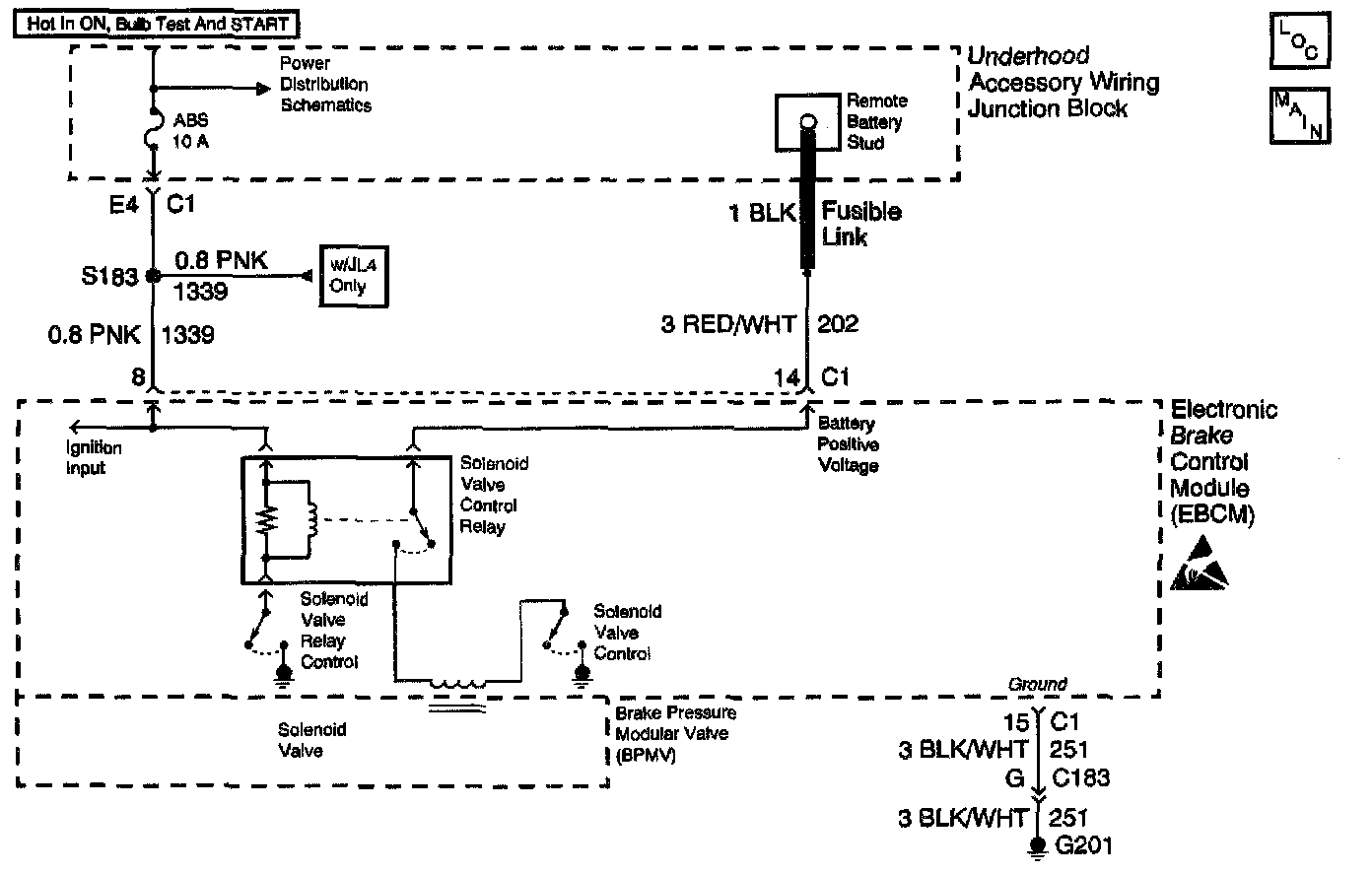 The isolation valve solenoid circuits are supplied with battery power when the ignition is in the ON position. The EBCM controls the valve functions by grounding the circuit when necessary.
