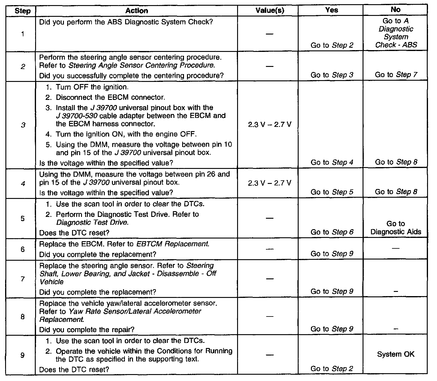 The EBCM triggers a yaw rate sensor test every 40 milliseconds and switches the sensor into test mode. The EBCM sends a test signal to the sensor via the test circuit. When the test is run, the measured yaw rate from the sensor to the EBCM must be in the range of 25° per second ± 7° per second. At standstill, the vehicle yaw rate is zero. The yaw rate signal at standstill is called the offset. If calibration at standstill is not possible, a quick calibration during driving is done. The measured yaw rate is calibrated to a calculated reference yaw rate signal. Yaw rate sensor sensitivity is estimated by comparison of the reference yaw rate and the measured yaw rate during cornering.