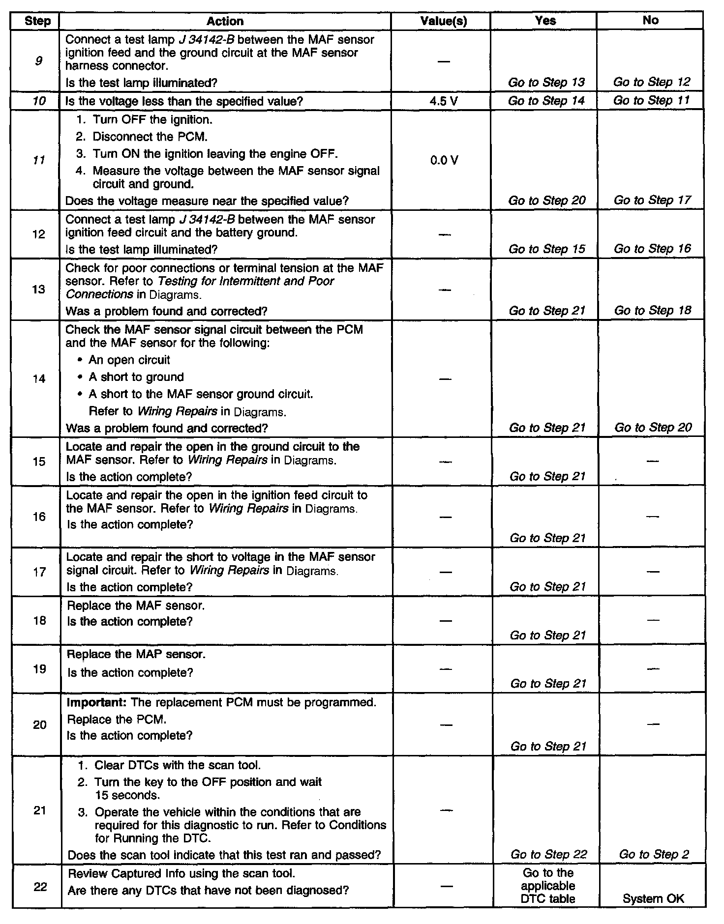 2. The MAF system performance or rationality diagnostic uses the Manifold Absolute Pressure (MAP) and Throttle Position (TP) sensor signals along with other inputs in order to calculate an expected airflow rate. The PCM then compares the expected flow rate to the actual measured airflow from the MAF sensor. Diagnose the listed DTCs before running this table.