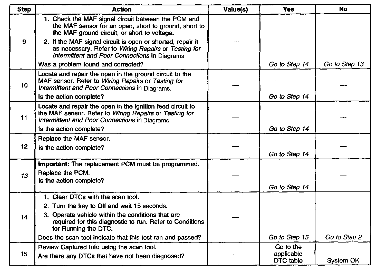 5. A voltage reading of less than 4 or more than 6 volts at the MAF sensor signal circuit indicates a malfunction in the wiring or a poor connection.