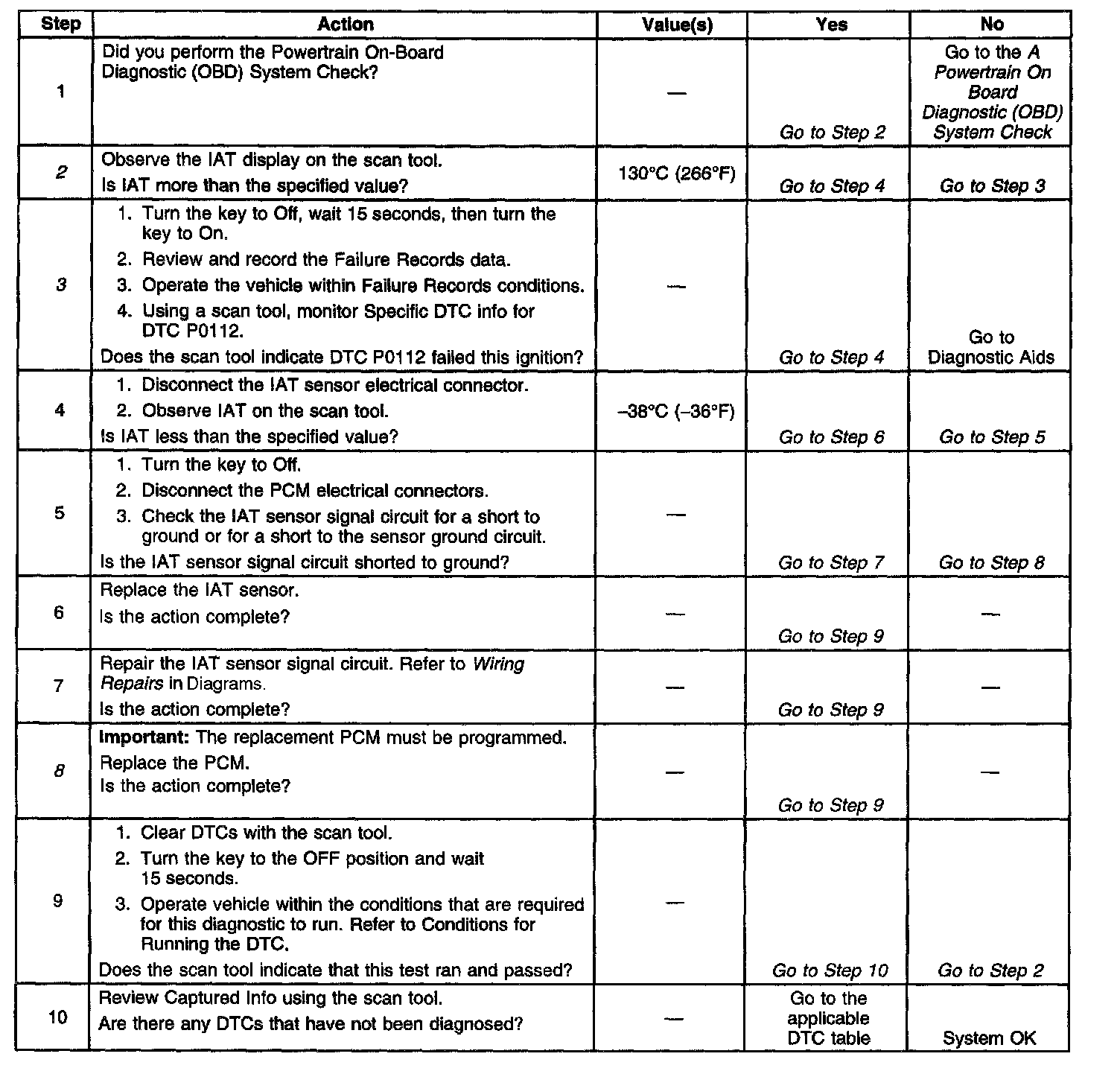 3. If DTC P0112 can be repeated only by duplicating the Failure Records conditions, refer to the Temperature vs Resistance table The table may be used to test the IAT sensor at various temperatures to evaluate the possibility of a shifted sensor that may be shorted above or below a certain temperature. If this is the case, replace the IAT sensor.