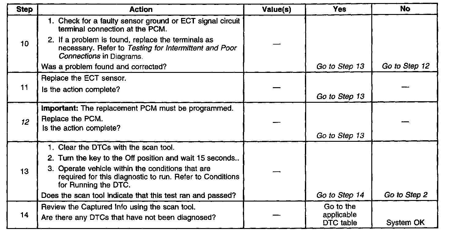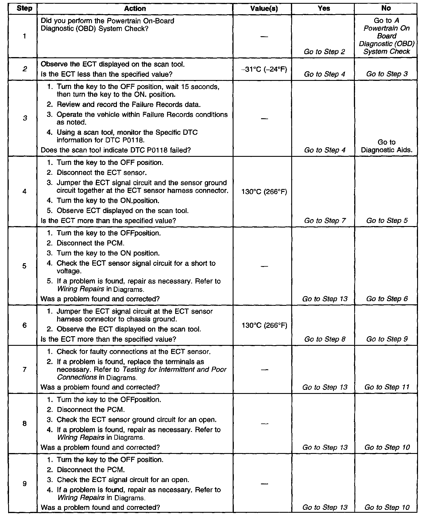Check for a skewed or incorrectly calibrated ECT sensor. Refer to the Temperature vs Resistance table. If DTC P0118 cannot be duplicated, the information included in the Fail Records data can be useful in determining vehicle mileage since the DTC was last set.