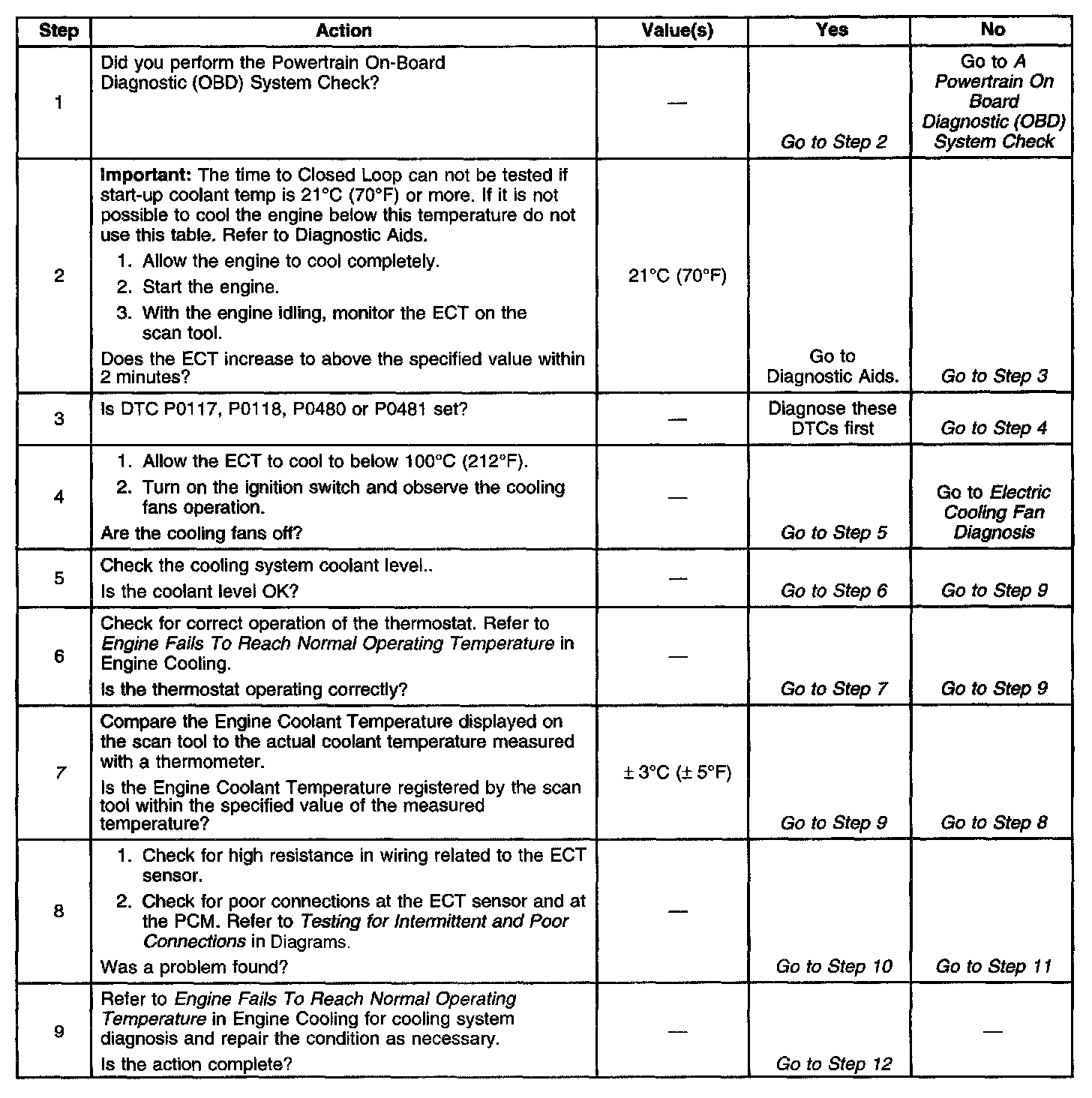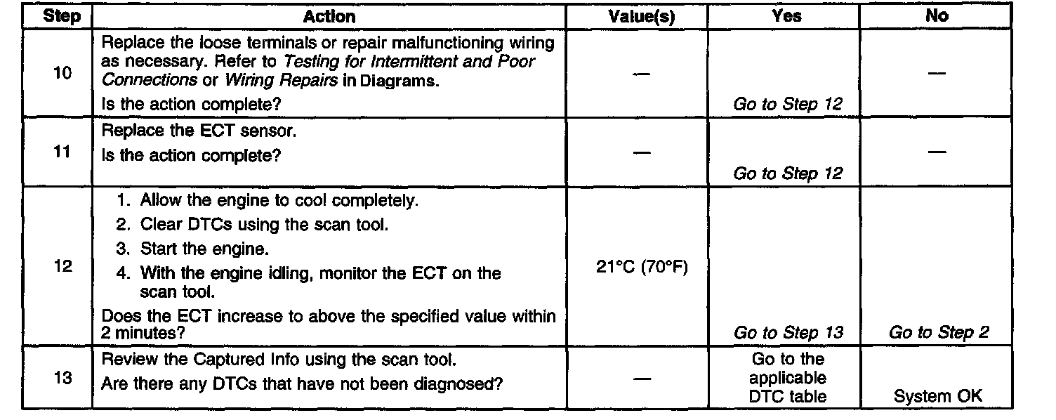 ^ Check for high resistance in wiring related to the ECT sensor. Also, check for poor connections at ECT sensor and PCM. Refer to Testing for Intermittent and Poor Connections in Diagrams.