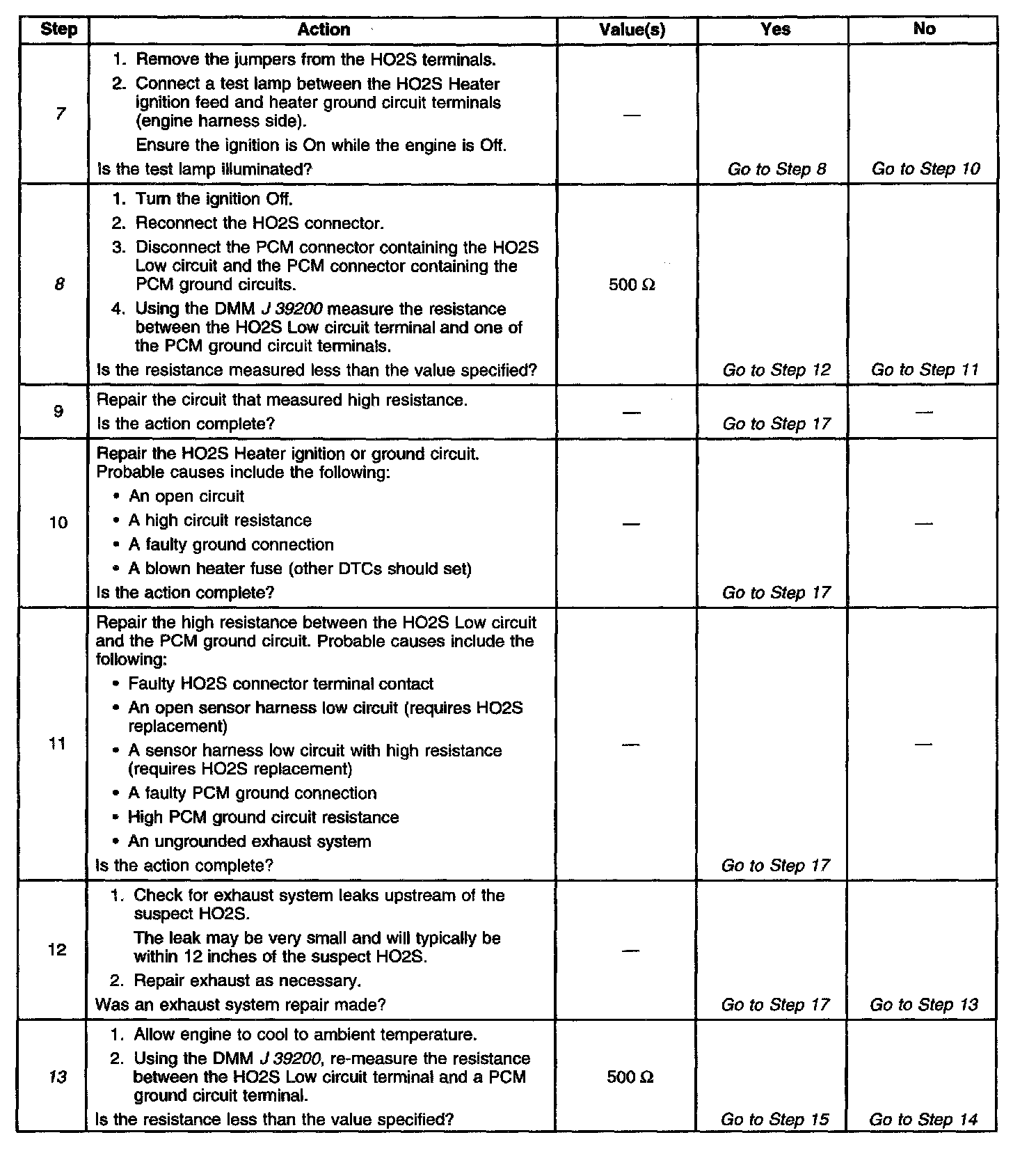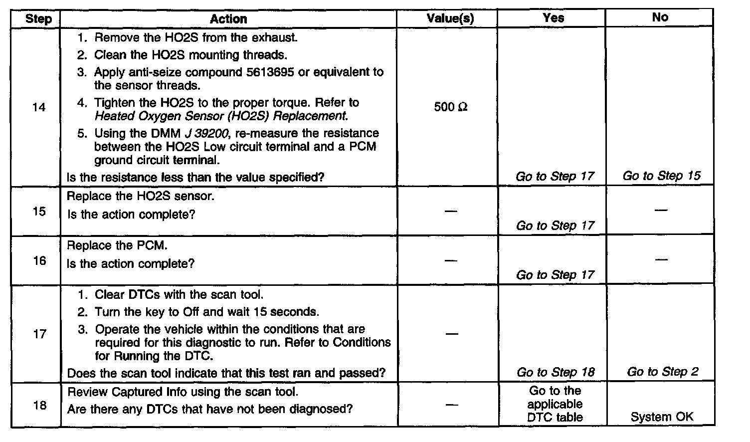 13. This step checks for proper circuit resistance between the HO2S Low circuit and PCM ground with a COLD sensor. A loose HO2S or poor thread to exhaust electrical contact will cause higher resistance when the HO2S is cold. Although 500 ohms is allowed, typical resistance should be less than 50 ohms.