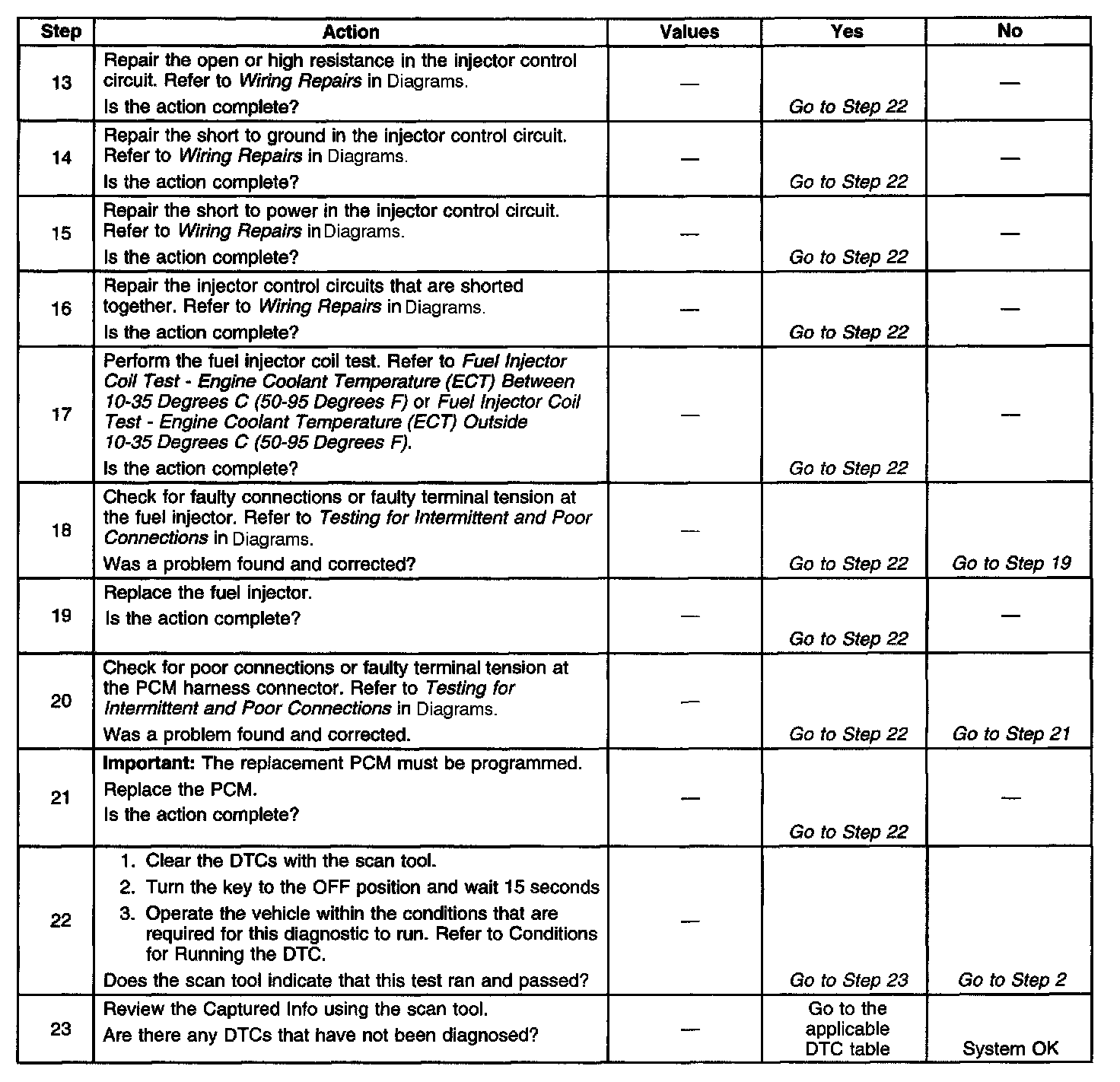 The numbers below refer to the step numbers on the diagnostic table.