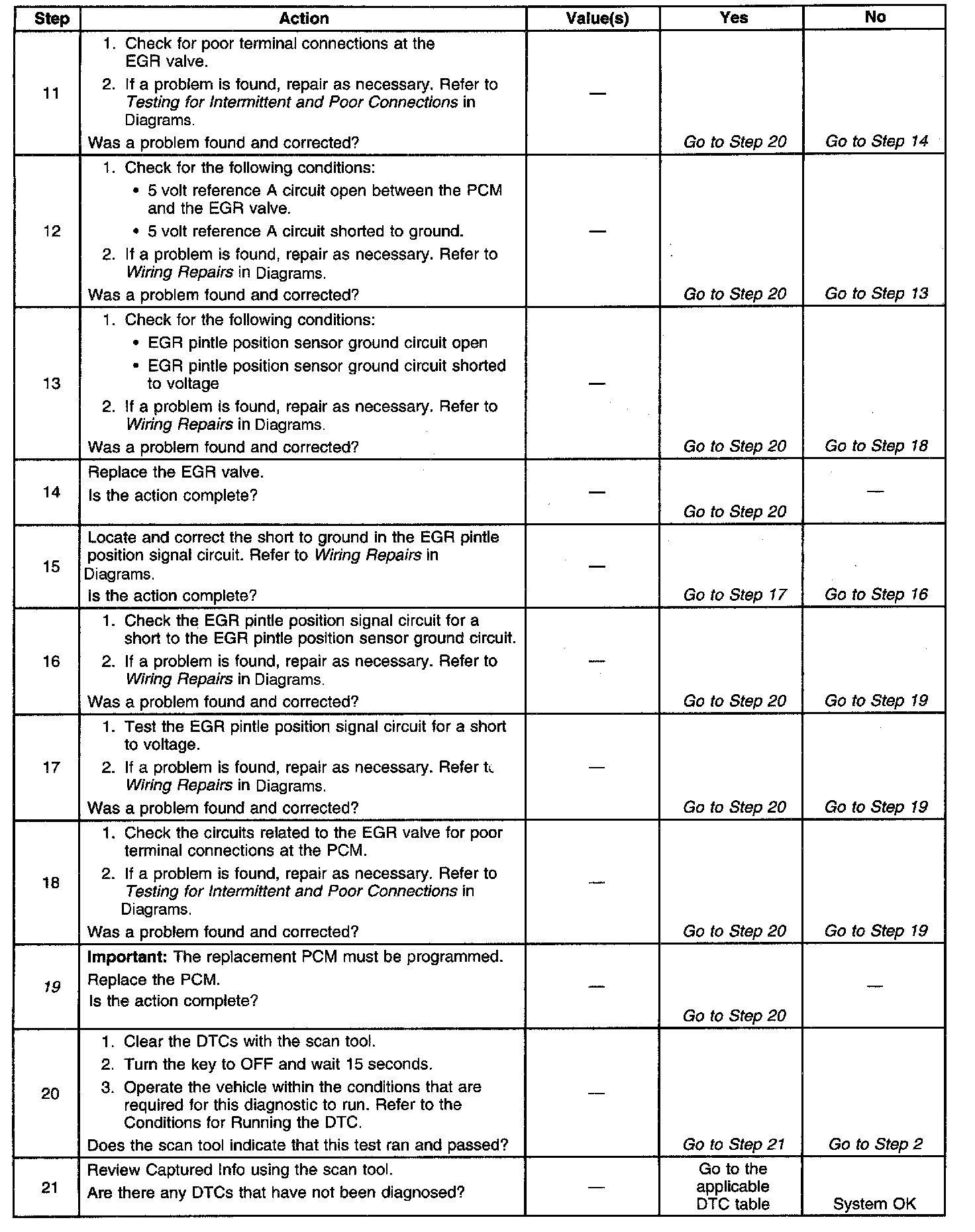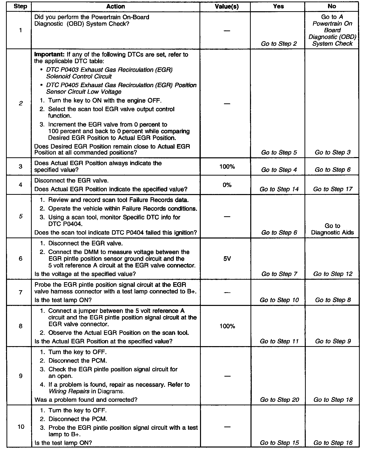 5. If DTC P0404 will only set under certain conditions, the malfunction may be intermittent. Refer to Diagnostic Aids. If an intermittent problem is suspected, check for poor connections at the PCM or the EGR valve. If the wiring and connections are OK and DTC P0404 continues to set, replace the EGR valve.