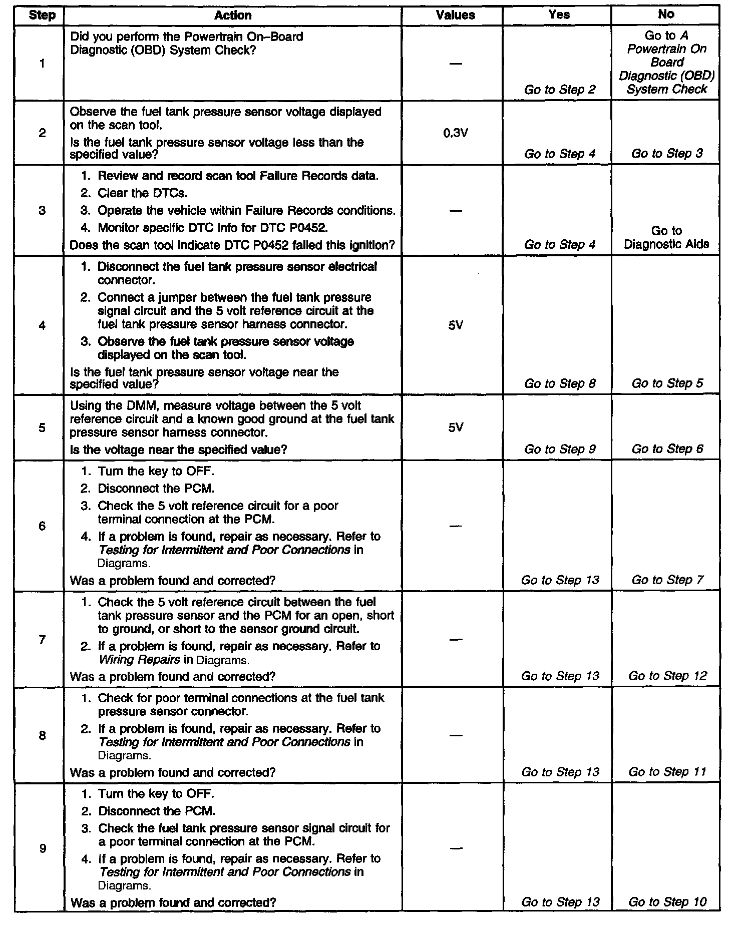 The Powertrain Control Module (PCM) monitors the fuel tank pressure sensor signal to detect vacuum decay and excess vacuum during the enhanced Evaporative Emission (EVAP) diagnostic. The fuel tank pressure sensor measures the difference between the air pressure, or vacuum, in the tank and the outside air pressure. The PCM applies a 5.0 volt reference and ground to the sensor. The sensor will return a signal voltage between 0.1 and 4.9 volts. If the PCM detects a fuel tank pressure sensor signal that is excessively low, DTC P0452 will set.