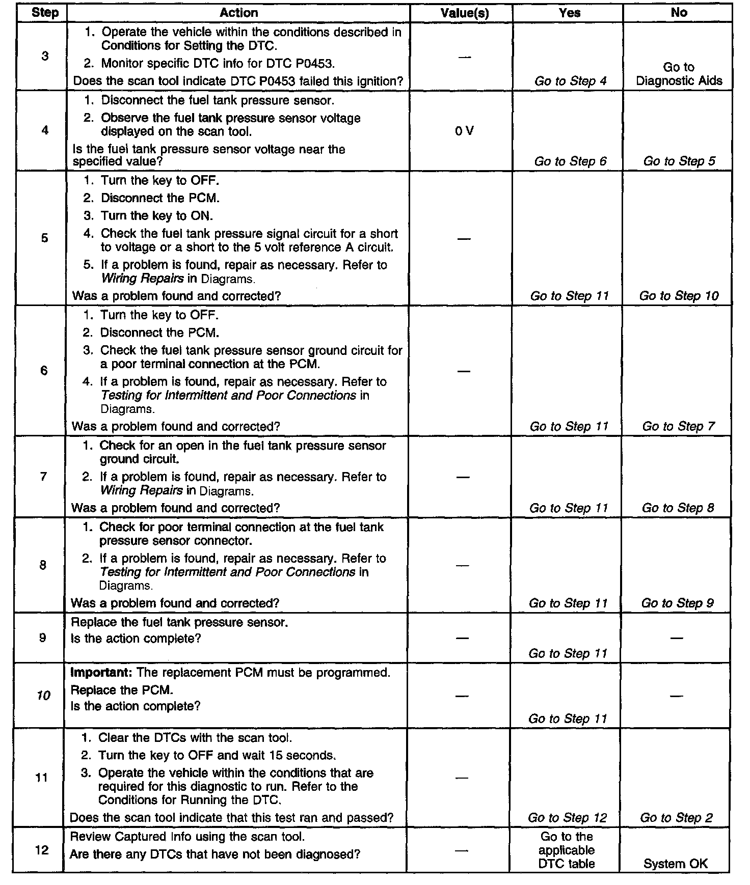 The Powertrain Control Module (PCM) monitors the fuel tank pressure sensor signal to detect vacuum decay and excess vacuum during the enhanced Evaporative Emission (EVAP) diagnostic. The fuel tank pressure sensor measures the difference between the air pressure, or vacuum, in the tank and the outside air pressure. The PCM applies a 5.0 volt reference and ground to the sensor. The sensor will return a signal voltage between 0.1 and 4.9 volts. If the PCM detects a fuel tank pressure sensor signal that is excessively high, DTC P0453 will set.