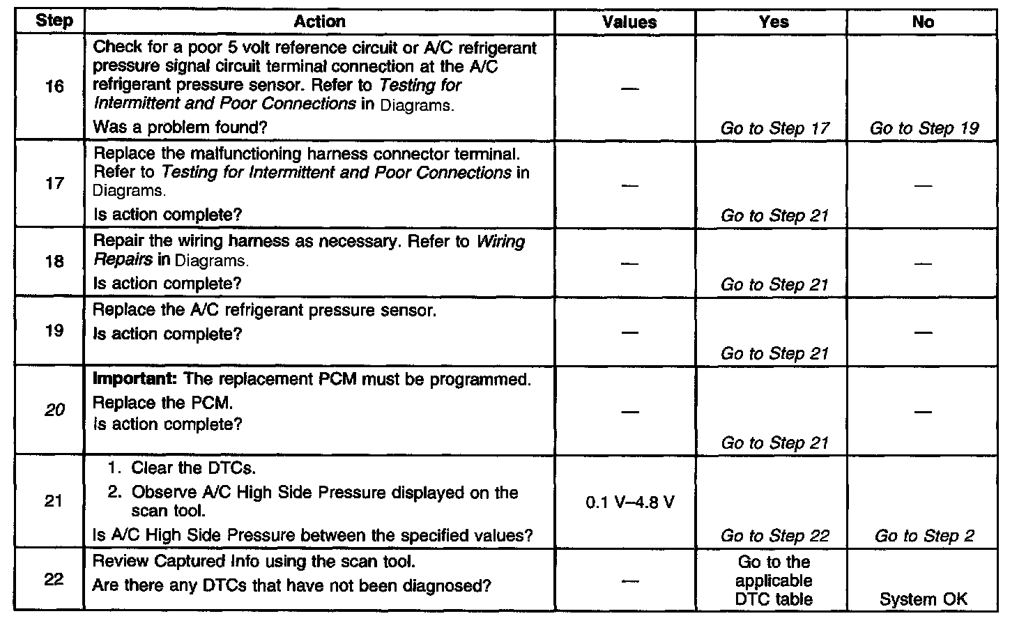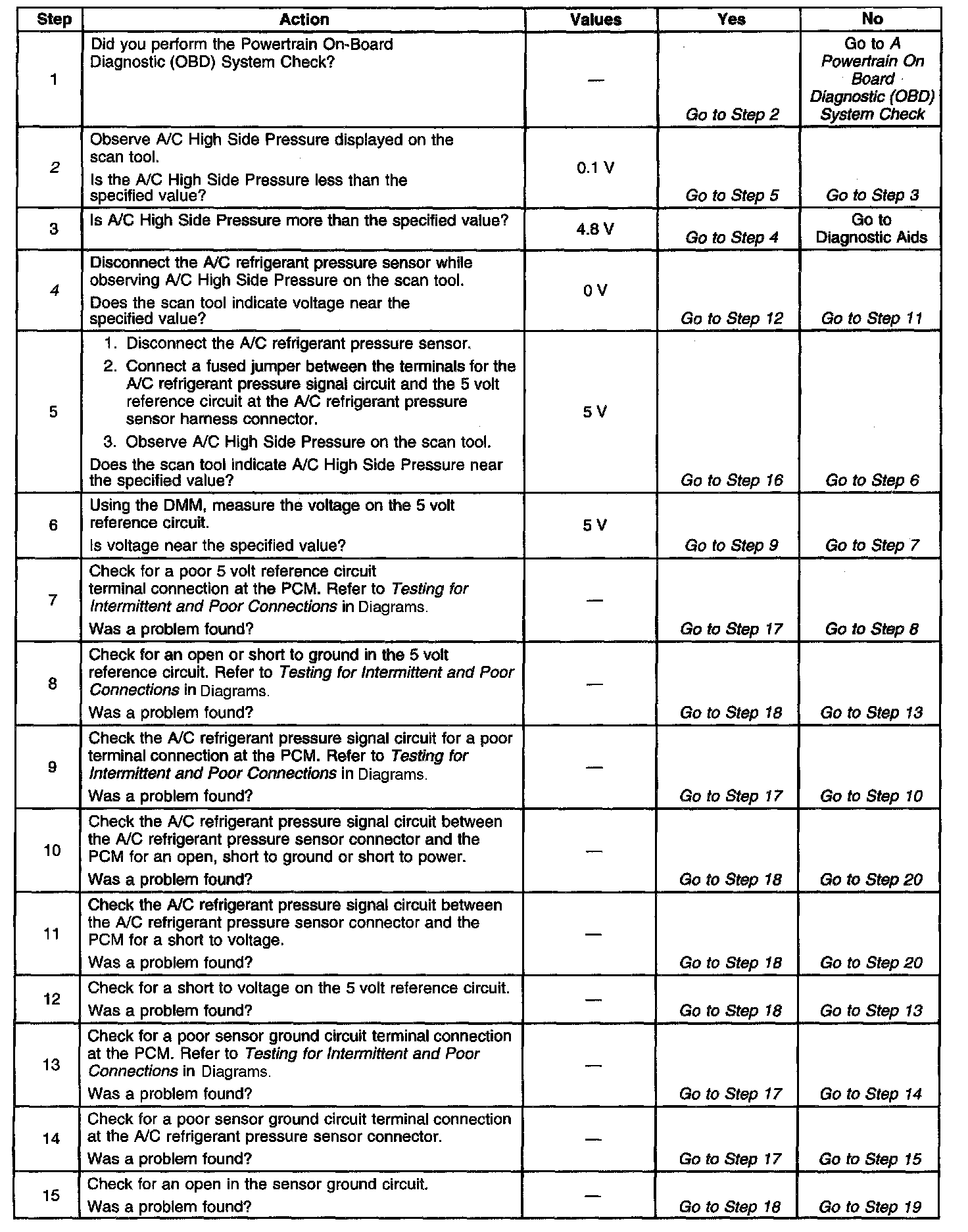 4. If the A/C refrigerant pressure signal voltage stays high after disconnecting the A/C refrigerant pressure sensor electrical connector, the signal circuit is shorted to voltage or the PCM is malfunctioning.