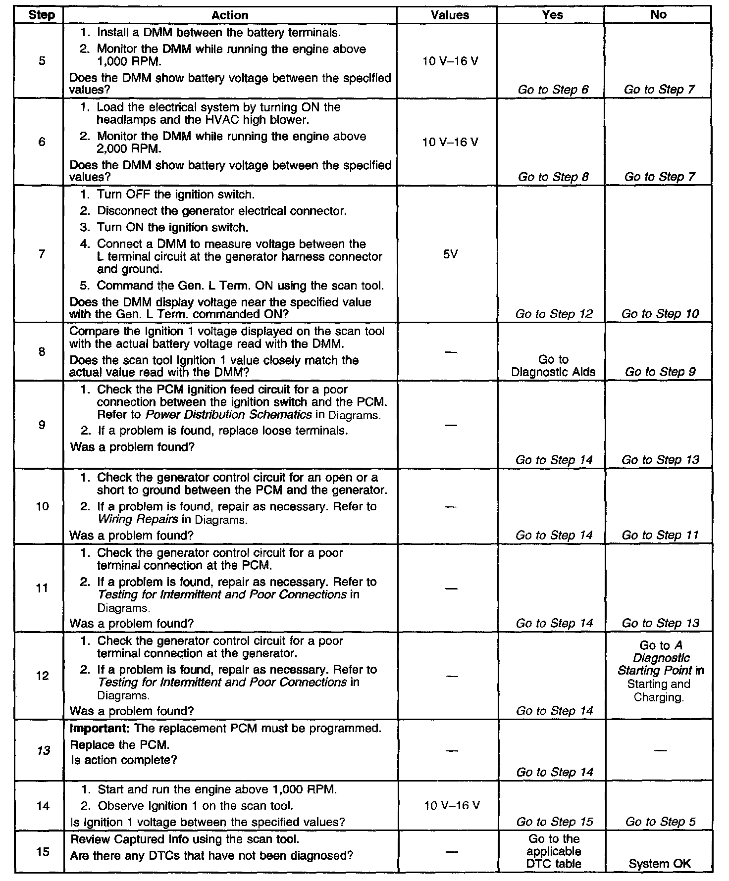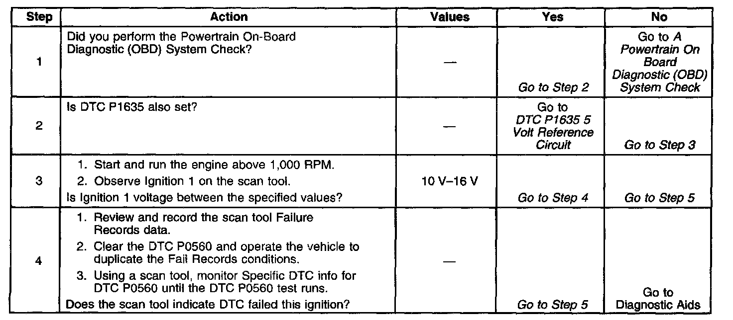 If DTC P0560 cannot be duplicated, reviewing the Failure Records vehicle mileage since the diagnostic test last failed may help determine how often the condition that caused the DTC to set occurs. This may assist in diagnosing the condition. For complete information and additional diagnostics for the vehicle charging system, refer to A Diagnostic Starting Point in Starting and Charging. Testing and Inspection