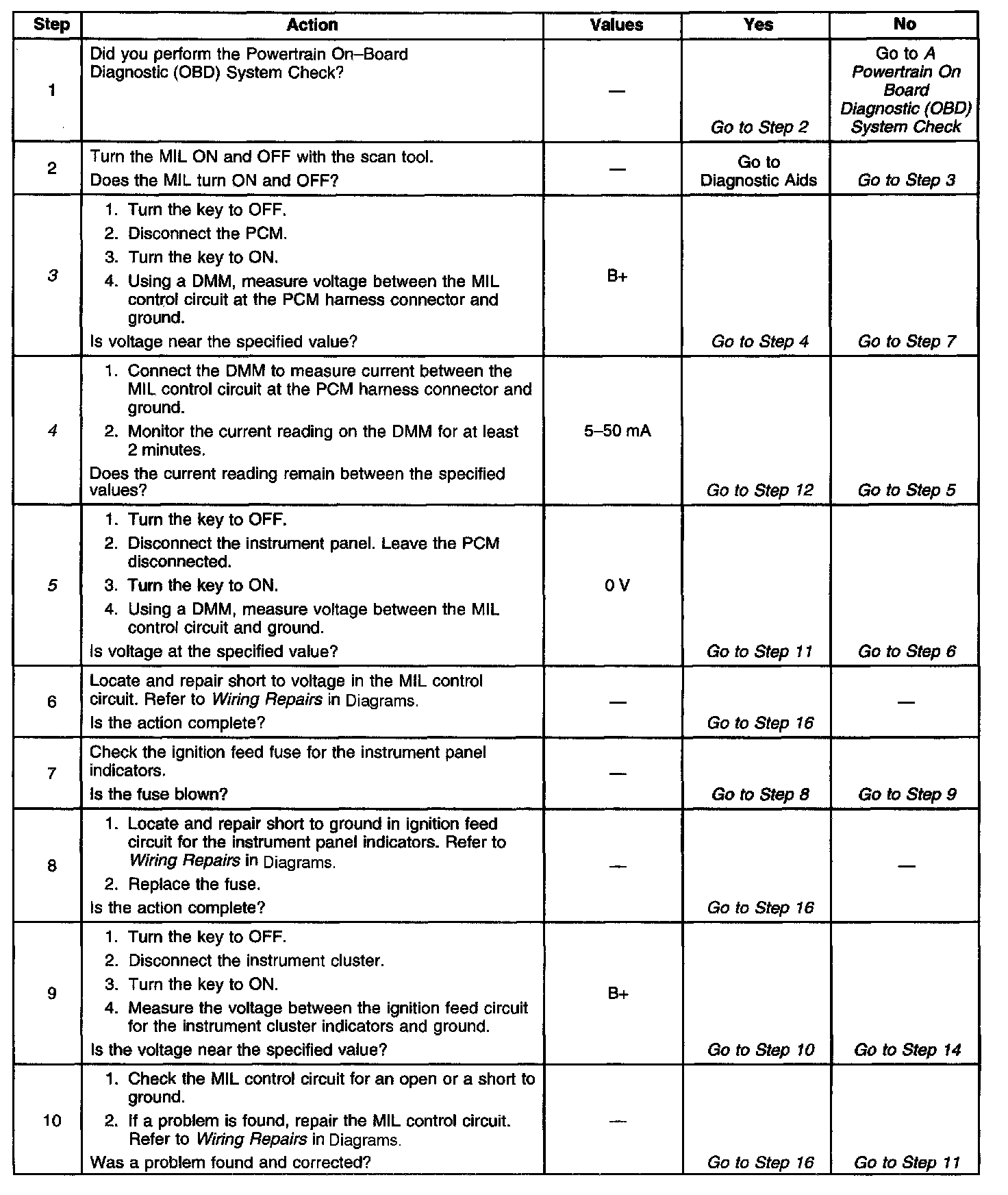 IMPORTANT: The MIL is actually a Lamp Emitting Diode (LED). An LED requires a parallel dropping resistor in order to operate on a 12 volt system. If the LED burns out, the dropping resistor will still pass voltage on to the PCM, and the MIL Diagnostic Trouble Code (DTC) may not set even though the MIL is inoperative. If the power supply circuit to the indicator lamps and the MIL control circuit check out OK, the Instrument Panel (IP) cluster needs to be checked for a faulty LED. Refer to A Diagnostic System Check -instrument cluster in Instrument Panel, Gauges and Console. Instrument Panel, Gauges and Warning Indicators