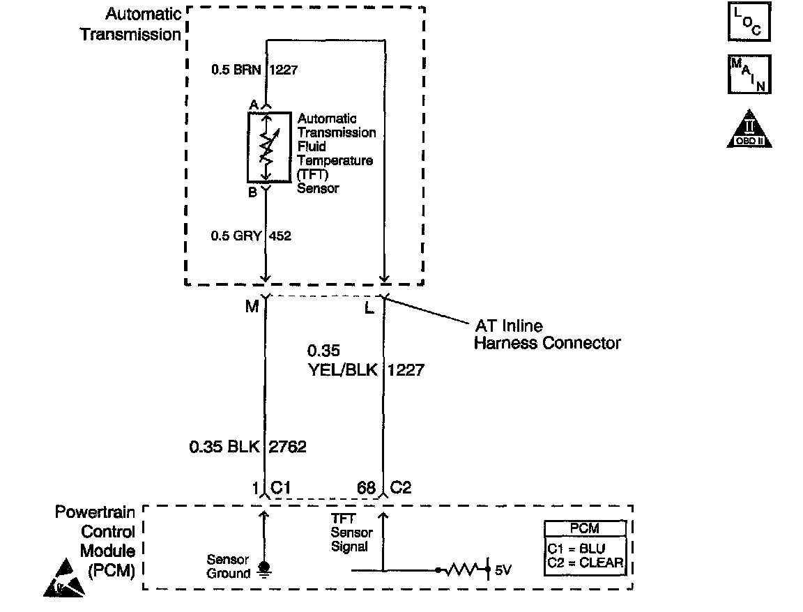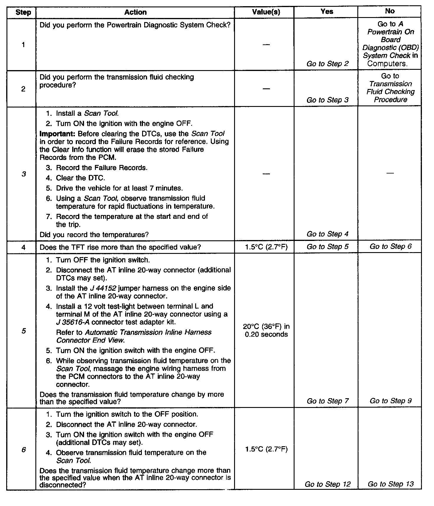 ^ Test the TFT sensor at various temperature levels to evaluate the possibility of a skewed (mis-scaled) sensor. Refer to the Transmission Fluid Temperature (TFT) Sensor Specifications table.