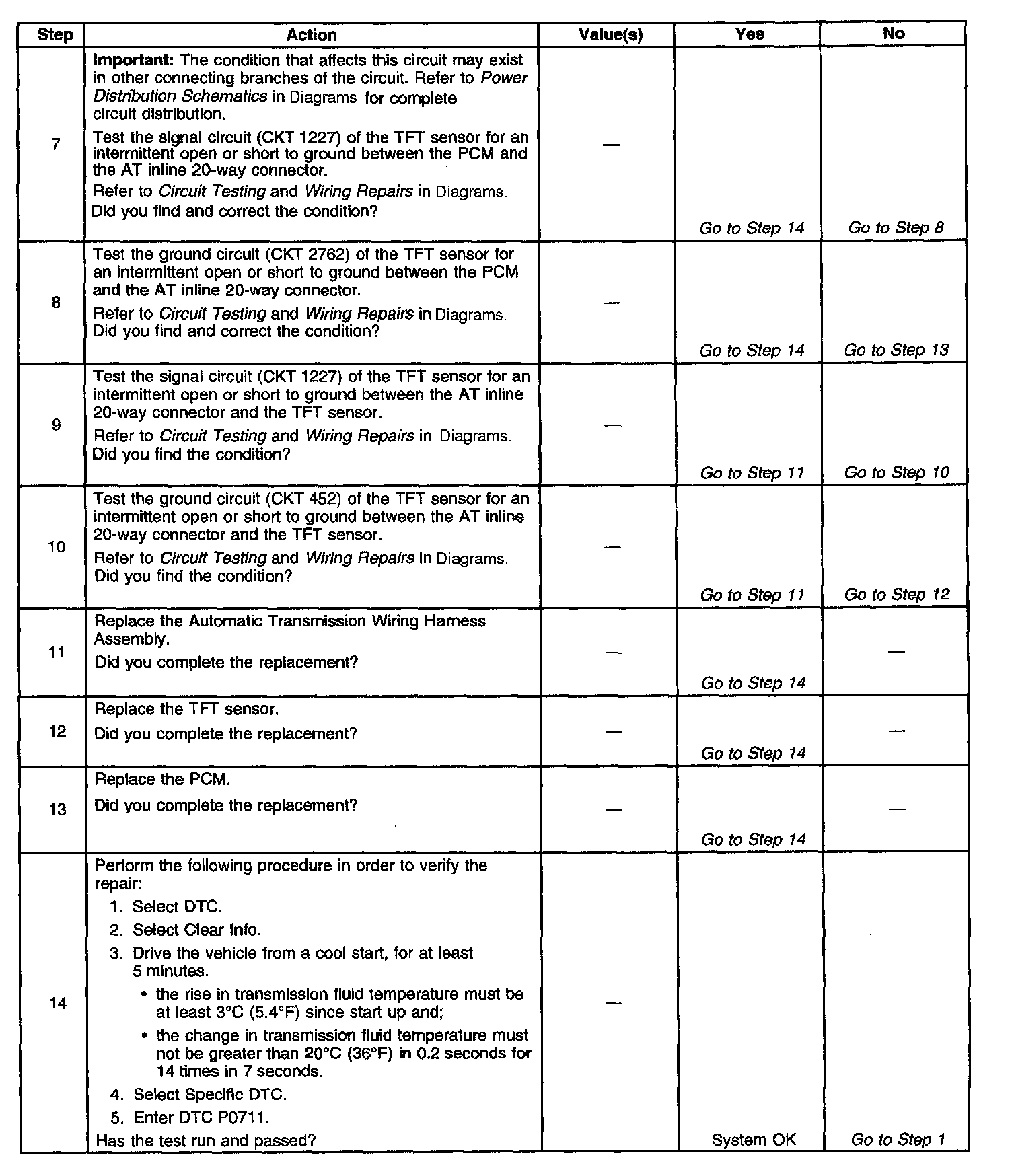 If the PCM detects an intermittent voltage or no voltage change in the TFT sensor circuit, then DTC P0711 sets. DTC P0711 is a type C DTC.