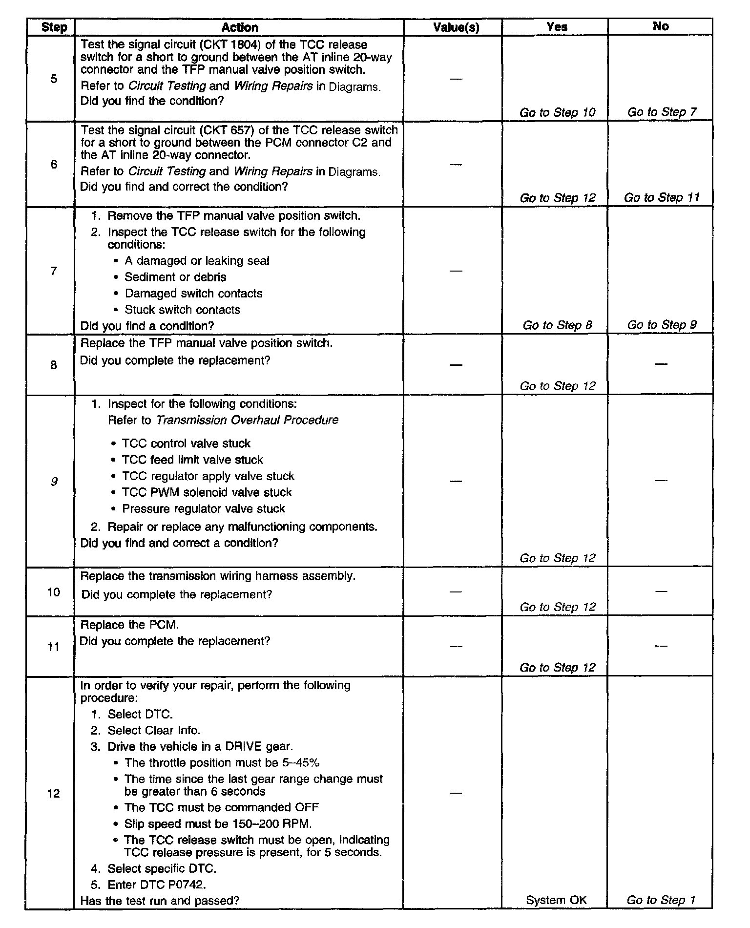 If the PCM detects that the TCC release switch is closed when the TCC is commanded OFF, then DTC P0742 sets. DTC P0742 is a type A DTC.