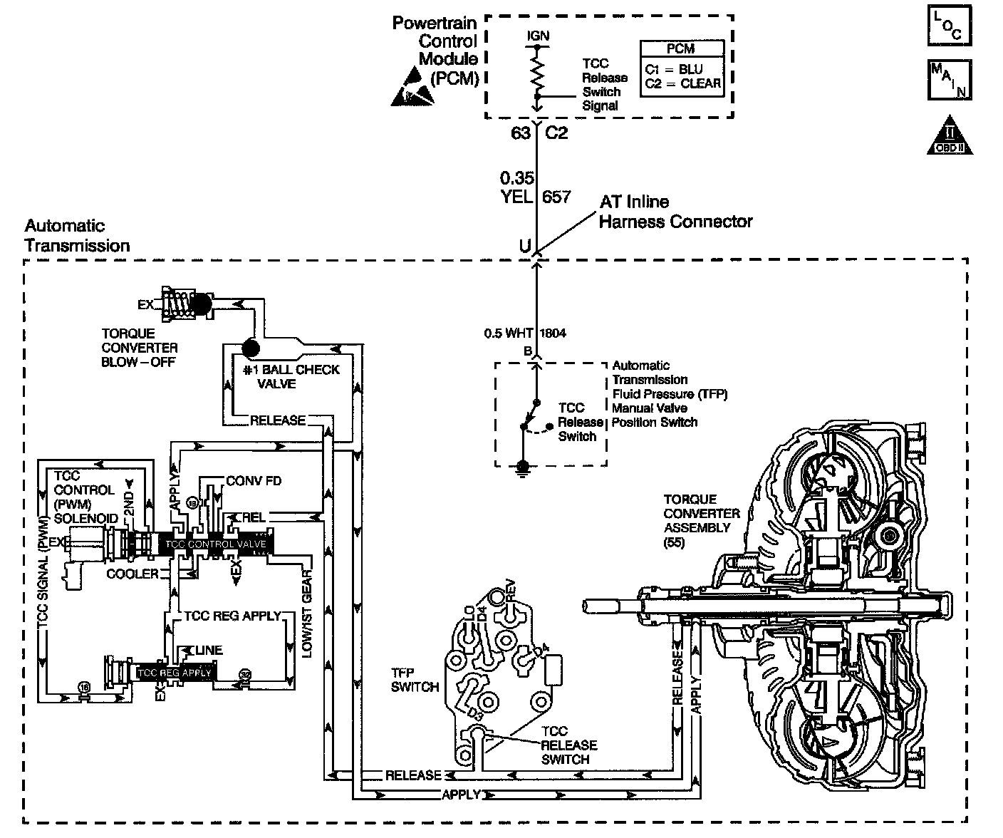 The TCC release switch is a normally-closed switch. When the TCC is released, TCC release fluid pressure opens the TCC release switch which opens the TCC release pressure circuit. When the voltage on the circuit is high (switch open), the PCM recognizes that the TCC is no longer engaged.