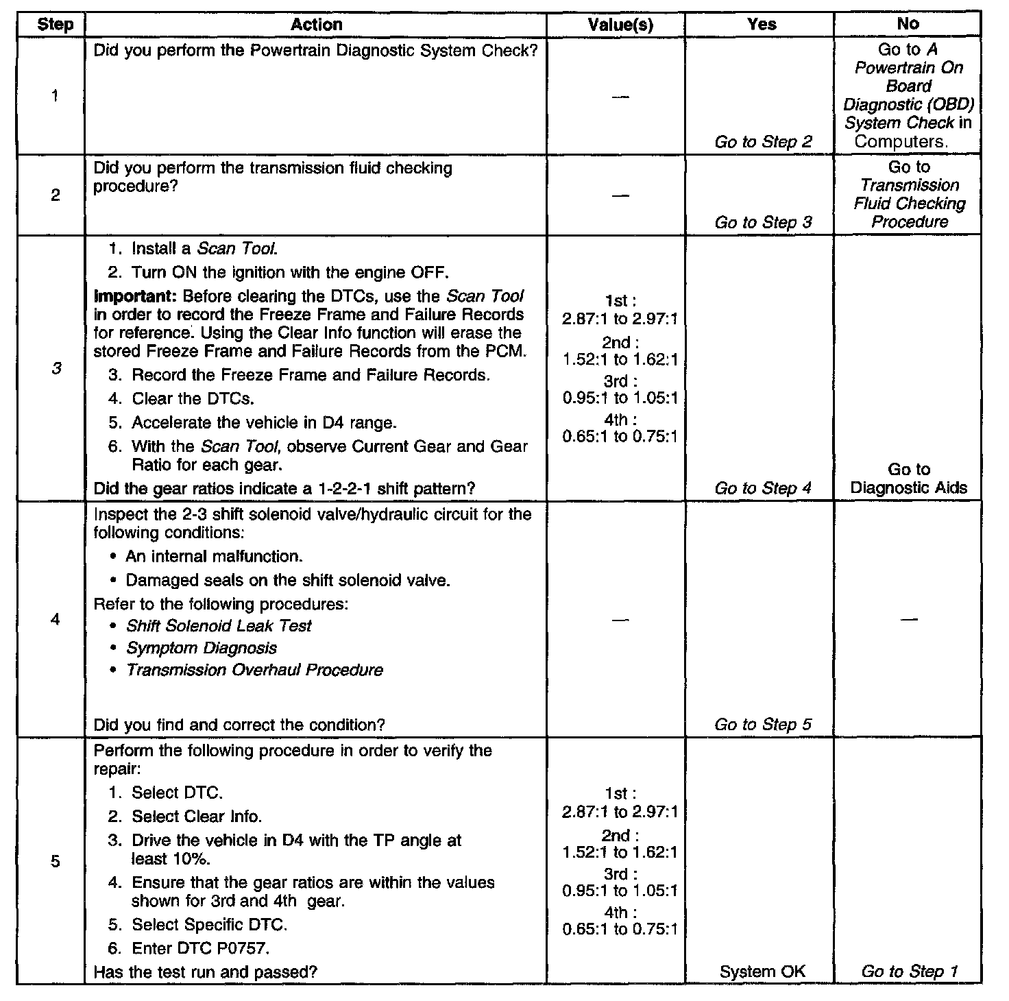 If the PCM detects a 2nd gear ratio when 3rd gear is commanded and a 1st gear ratio when 4th gear is commanded, then DTC P0757 sets. DTC P0757 is a type A DTC.