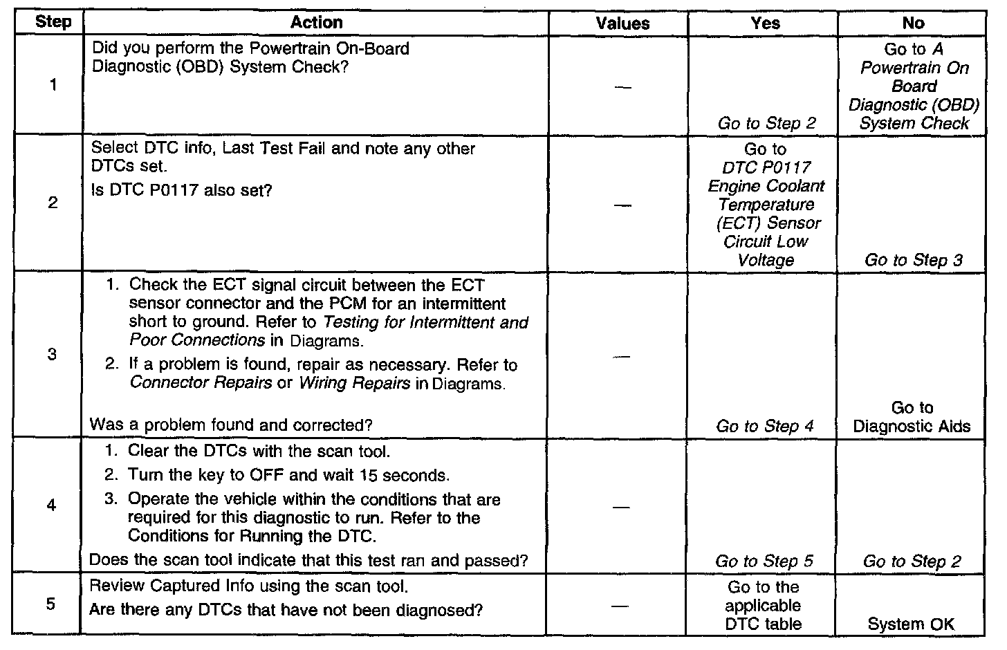 ^ A damaged harness - Inspect the wiring harness for damage. If the harness appears to be OK, observe the ECT display on the scan tool while moving connectors and wiring harnesses related to the ECT sensor. A change in the ECT display will indicate the location of the malfunction.