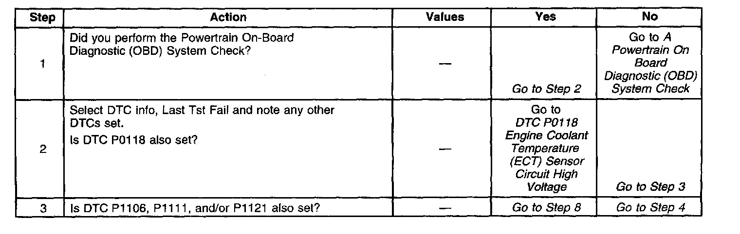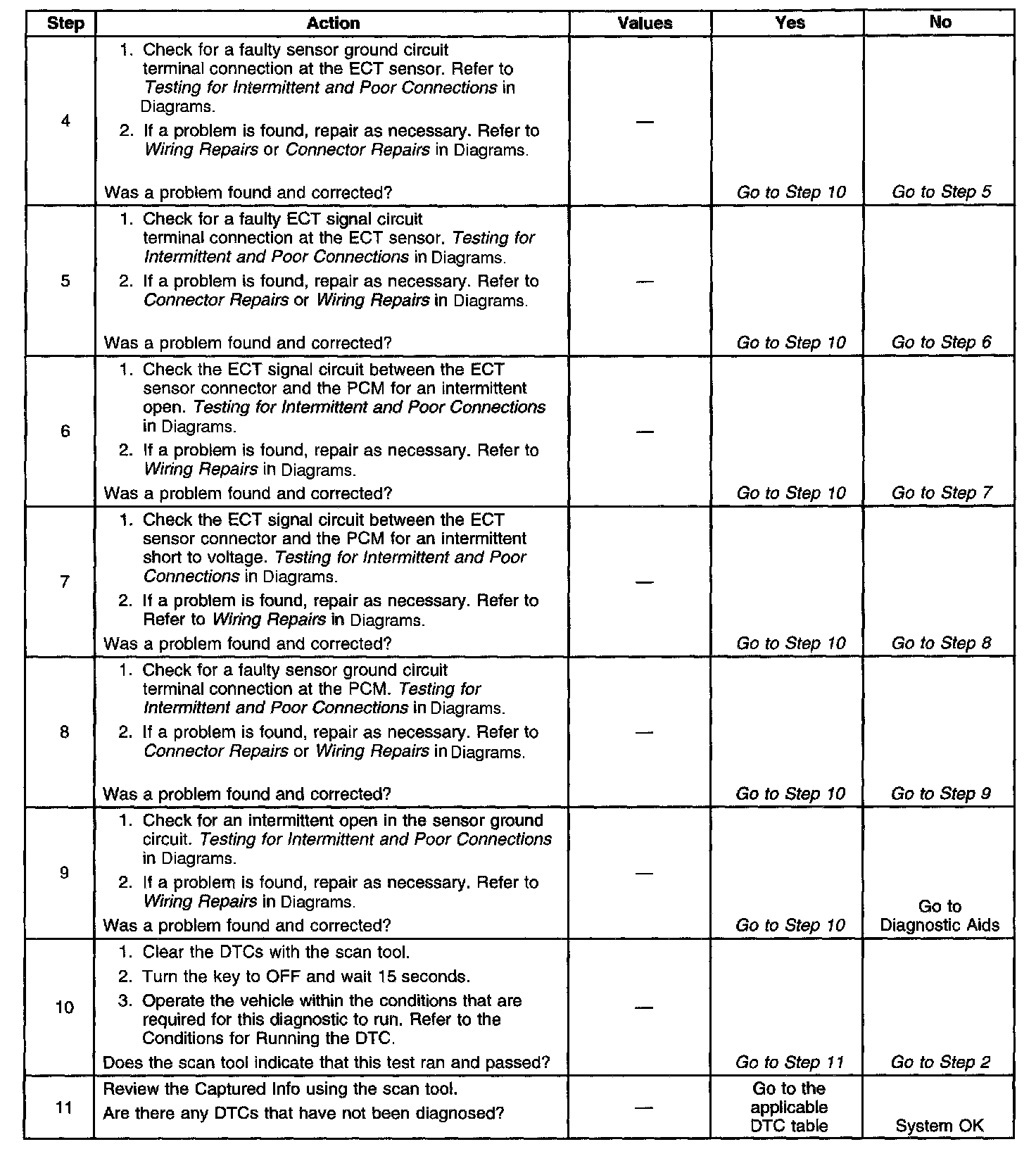 ^ A damaged harness - Inspect the wiring harness for damage. If the harness appears to be OK, observe the ECT display on the scan tool while moving connectors and wiring harnesses related to the ECT sensor. A change in the ECT display will indicate the location of the malfunction.