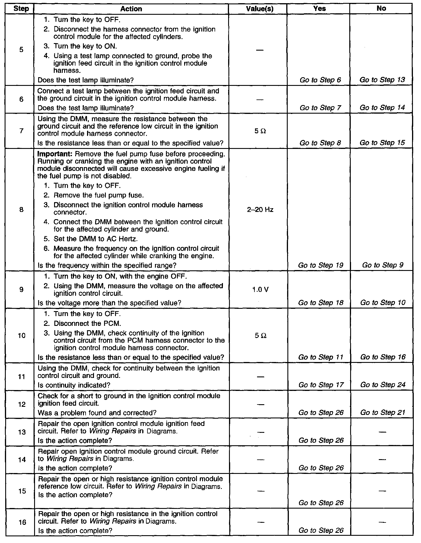 The numbers below refer to the step numbers on the diagnostic table.