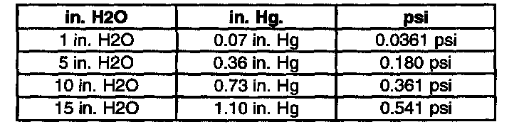 The vacuum and pressure in the EVAP system is measured in inches of Water (H2O). Most gauges measure vacuum in inches of Mercury (Hg) and pressure in pounds per square inch (psi). The table shows how the values compare.