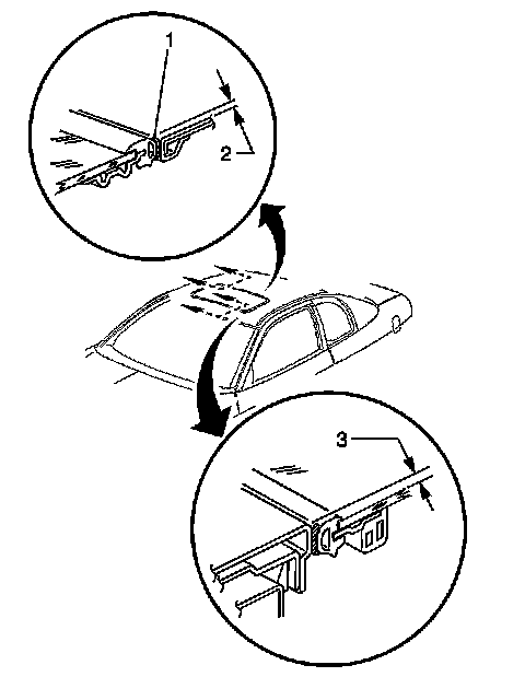 5. Adjust the front of the sunroof glass panel. Ensure that the sunroof glass panel front (3) is 0.5 mm (0.020 in) below the top surface of the roof panel. Also, the sunroof glass panel seal (1) is centered.