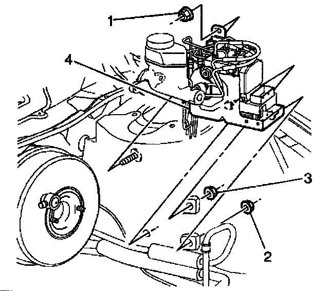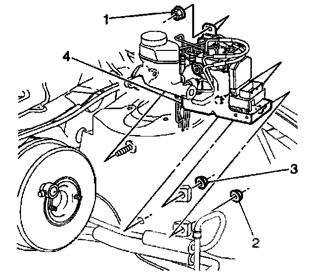 3. Remove the three BPMV bracket nuts (1,2,3) attaching the BPMV bracket (4) to the wheel housing.