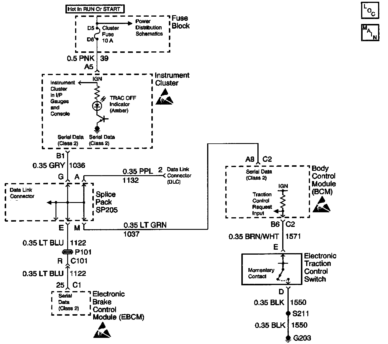 The TRAC OFF indicator is controlled by the EBCM by sending class 2 messages to the instrument panel cluster (IPC). It is turned on when the EBCM sets a DTC that turns on the TRAC OFF indicator. It is also turned on or off when the traction control switch is pressed. The body control module (BCM) receives the input from the traction control switch, the BCM then sends a class 2 message to the EBCM telling the EBCM the state of the switch. The BCM supplies 12 volts to the TCS switch, when the TCS switch is pressed the BCM sees the voltage go low and sends the EBCM the message that the TCS switch state has changed. When the EBCM receives the message from the BCM that the switch state has changed, the EBCM turns on or off traction control and sends a message to the IPC to turn on or off the TRAC OFF indicator depending on its previous state.
