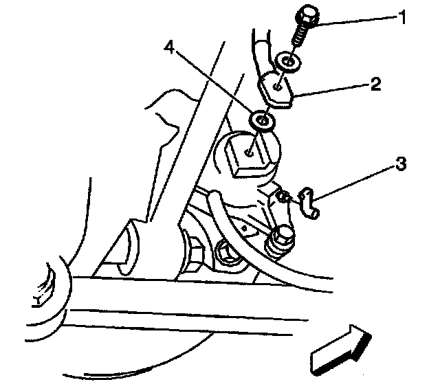1. Assemble two NEW sealing washers (4) and the brake hose-to-caliper bolt (1) to the brake hose (2).