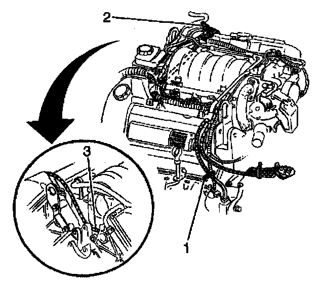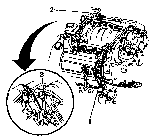 4. Remove the engine right coolant heater cord from behind the power steering pump (3).