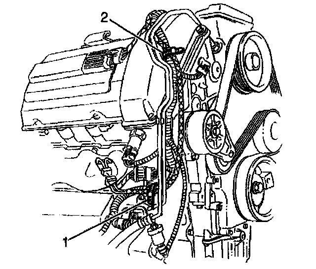 4. Install a new upper right coolant heater cord strap (2) at the engine wiring harness by the power steering lines.