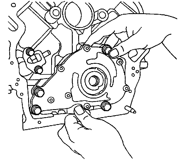 2. Slide the oil pump assembly off the nose of the crankshaft with the drive sprocket in place.