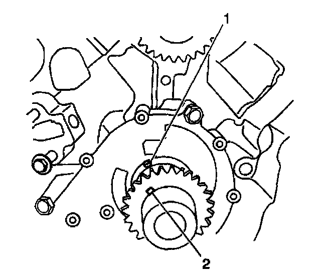 2. Place the pump and sprocket assembly in position by rotating the crankshaft sprocket until the machined slot (2) is indexed with the drive pin (1) in the crankshaft.
