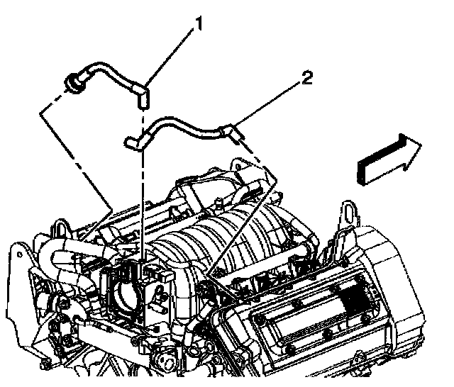 2. Disconnect and remove the PCV valve and both feed tubes (1, 2) from the camshaft covers and intake manifold.