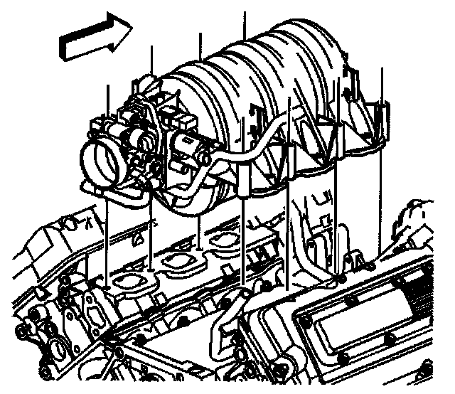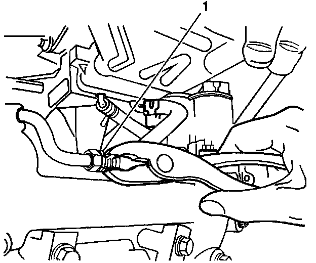 8. Disconnect the throttle body coolant hose (1) from the water crossover feed tube.